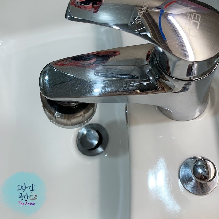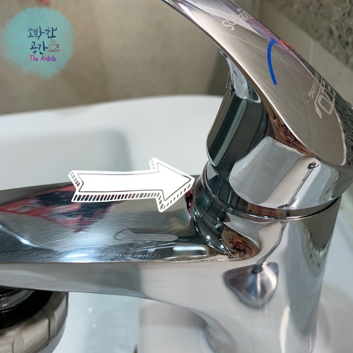 사진처럼 수전 손잡이 아래 부분도 얇은 솔이나 매직 스펀지로 닦아주세요. 보이는 부분이 깨끗하면 한 번씩 세면대 배수관 청소도 해주세요. 칠지도같이 생긴 청소도구로 아시죠?