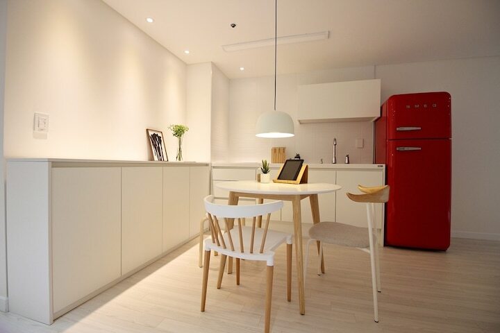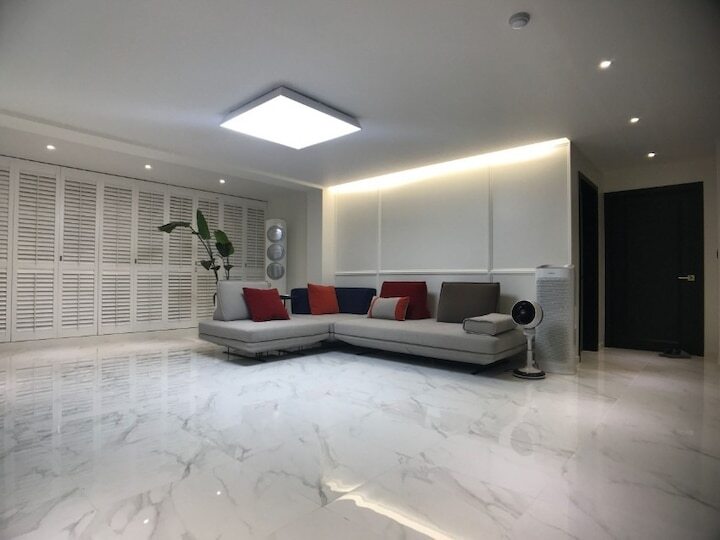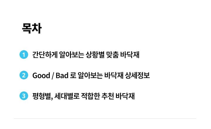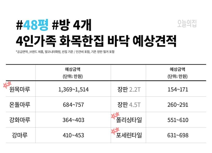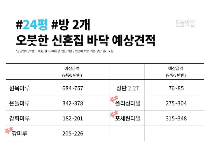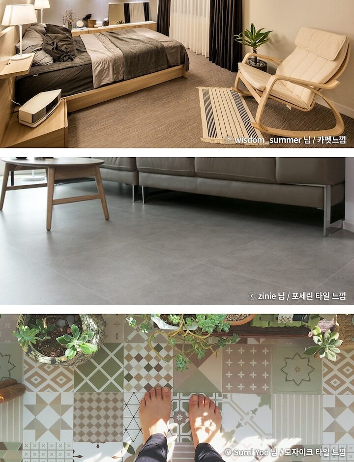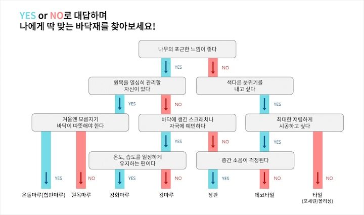 나에게는 어떤 바닥재가 어울릴까? 우리 집에 어떤 바닥이 적절할까? Yes or No로 선택하다보면 적합한 바닥재를 찾아드려요. 내 맘 속의 베스트를 정하고 아래 설명을 읽으면 더 편하고 확실하게 바닥재를 결정할 수 있으니, 지금 바로 선택 시작! 아이가 있는 경우에는 물로 쉽게 닦아낼 수 있고 충격 완화 효과도 있는 두께 4.5T* 이상의 장판을 추천합니다. 최근 소음방지 효과를 높인 기능성 장판 제품들이 많이 나오고 있어요. ② 손님들이 '우와~' 할만한 색다른 분위기의 바닥을 갖고 싶어요 고급스럽고 우아한 분위기를 연출하고 싶다면 대리석 무늬와 광택이 우아한 폴리싱 타일을 추천해요. 세련되고 깔끔한 느낌으로 색다름을 표현하고 싶다면 무광의 포세린 타일! ③ 저렴한 가격으로 눈에 띄는 분위기 전환을 하고 싶어요 저렴한 가격과 간단한 시공으로 분위기 전환이 가능한 데코타일을 추천합니다. 디자인이 매우 다양해서 원하는 분위기로 공간을 바꾸기가 좋아요. 2. Good / Bad 와 평당가격으로 알아보는 바닥재 상세정보! 위에서 여러 바닥재에 대해 간단히 살펴보셨나요? 어느정도 내 상황에 맞는 바닥재를 골랐다면, 왜 적합한지, 다른 것과 어떤 차이가 있는지 꼼꼼히 봐야할 차례! 2-1. 마루 세월이 지나도 변함없는 선호를 자랑하는 마루입니다. 마루는 크게 4종류로 나누어볼 수 있는데요, 사진으로 보기엔 비슷비슷할지 몰라도 실물과 디테일을 따져보면 달라도 참 다른 마루! 지금부터 찬찬히 살펴보아요. ① 원목마루 평당가격 약 30만원 (시공비 제외) Good 보행감과 촉감이 우수하고, 흠집이 생겼을 때 샌딩*해서 새 것처럼 쓸 수 있다는 장점도 있어요. Bad 원목의 특성상 열이나 습기에 쉽게 변형된다는 단점이 있어요. 열전도율도 낮아서 난방효율도 많이 떨어지구요. 표면 강도가 약해 흠집이 잘 생기고, 왁스를 사용해 주기적으로 관리해줘야 하는 불편도 있습니다. 가격도 마루 중에 가장 비싸요. ② 온돌(합판)마루 평당가격 약 15만원 (시공비 제외) Good 열과 습기에 잘 변형되지 않고, 상대적으로 저렴한 가격으로 원목에 가까운 나뭇결을 느낄 수 있어요. Bad 표면 강도가 약해 잘 긁히고 손상되는, 원목마루와 같은 단점을 가지고 있어요. ③ 강화마루 평당가격 약 5~7만원 (시공비 제외) Good 표면 강도가 좋아서 스크래치가 잘 나지 않고, 마루 중에서 가격이 제일 저렴해요. Bad 열과 습기에 취약해 잘 관리하지 않으면 계절에 따른 변형이 크게 일어나고, 따라서 끝부분 실리콘 마감이 불가능해서 작은 틈이 생길 수 있어요. 또한 클릭시공 방식으로 바닥에 완전 붙어있지 않기 때문에 삐걱거리는 소음이 나서 층간소음에 취약하고, 난방열 전달 효율이 떨어져요. ④ 강마루 평당가격 약 9만원 Good 마루 중에서는 열과 습기로 인한 변형이 가장 적고, 따라서 물로 쉽게 닦을 수 있어 오염 제거나 유지 관리도 편해요. 소음도 적고 표면 강도와 난방열전달도 우수해요. Bad 강화마루보다는 가격이 조금 비싸고 철거가 어려워요. 2-2. 장판 그렇다면 무조건 강마루인가! 하실 수 있지만, 오염과 손상에 강하고 난방열 전달도 잘되면서 가격까지 저렴한 완전체 아이템이 있으니 바로 장판입니다. 옛날의 쩍쩍 달라붙는 노란 비닐만 떠오른다면 지금 바로 다양한 장판 시공 사례를 찾아보세요. 다양한 디자인과 개선된 촉감으로 고급스러운 마감재로 재탄생한 장판을 만날 수 있답니다. 평당가격 (시공비 제외) 1.8~2.2T : 두께에 따라 2,3만원대에 고루 분포 3.0T : 6만원 중반 4.5T : 7만원 중반 Good 자재비 뿐만 아니라 시공과 철거가 간단하여 시공비까지 저렴합니다. 습기와 오염에도 강해서 관리도 아주 편하죠. 약간의 폭신한 느낌으로 편안한 보행감을 주는데, 최근에는 4.5T* 이상의 두툼한 장판으로 층간소음 방지 효과까지 있어 어린아이가 있는 집에서 인기가 높습니다. Bad 한 위치에 가구 등을 오래 두면 자국이 남고, 날카로운 물건을 떨어트리면 찢어질 수 있습니다. 2-3. 타일 '타일? 그거 욕실이랑 베란다에만 쓰는거 아냐? '라고 생각하셨다면 오산! 최근에는 거실을 중심으로 실내 생활 공간에도 타일을 시공하는 사례가 정말 많아요. 무난한 기본타일부터 화려하고 독특한 포인트 타일까지, 다양한 디자인과 분위기로 인기를 얻고 있는 타일에 대해 알아볼게요. ① 데코타일 평당가격 1만원 중반~3만원대 (시공비 제외) Good 장판보다 높은 압축률로 가공되어 찍힘이나 눌림에도 강해요. 습기에 강하고 오염관리가 쉬운 장판의 장점은 그대로 가지고 있구요. Bad 바닥 난방으로 인해 타일 사이가 벌어지는 경우가 종종 있습니다(온돌용 데코타일 제품은 이러한 점이 보완되어 있어요). 강력 접착제를 사용하기에 성분에 따라 안정성이 비교적 떨어질 수도 있으니 성분 확인 필수! ② 폴리싱타일과 포세린타일 평당가격 (시공비제외) 폴리싱 타일 : 약 5만원대~ 포세린 타일 : 약 6만원대~ Good 타일은 열전도율이 높아 냉난방 효율이 우수합니다. 금방 시원해지고 금방 따뜻해진다는 것! 수분에 강하고 청소가 쉬워서 세균이나 곰팡이가 잘 생기지 않아요. Bad 소음과 충격 흡수가 되지 않아서 깨지는 물건을 떨어트리면 사방