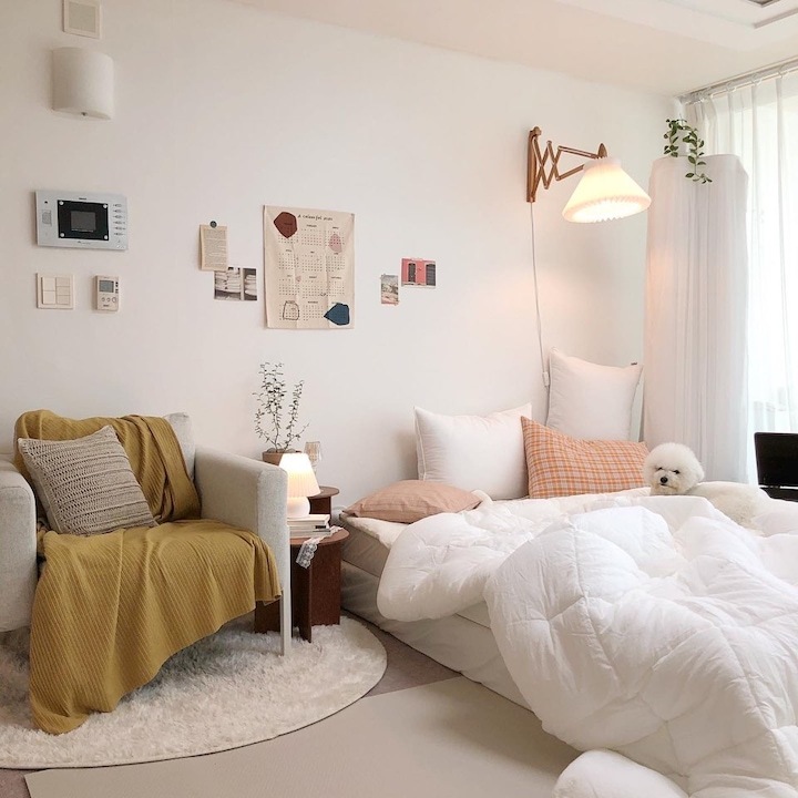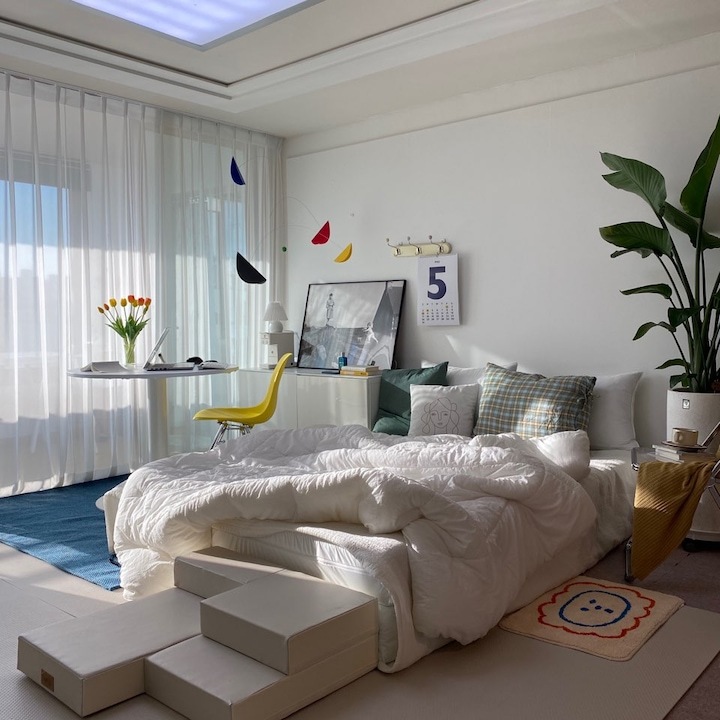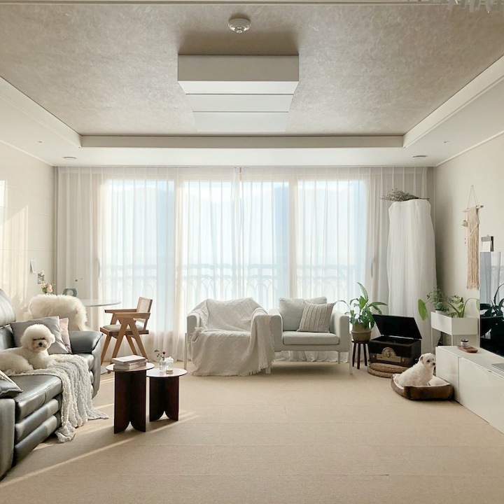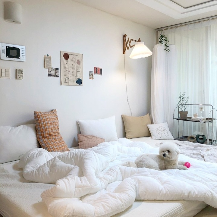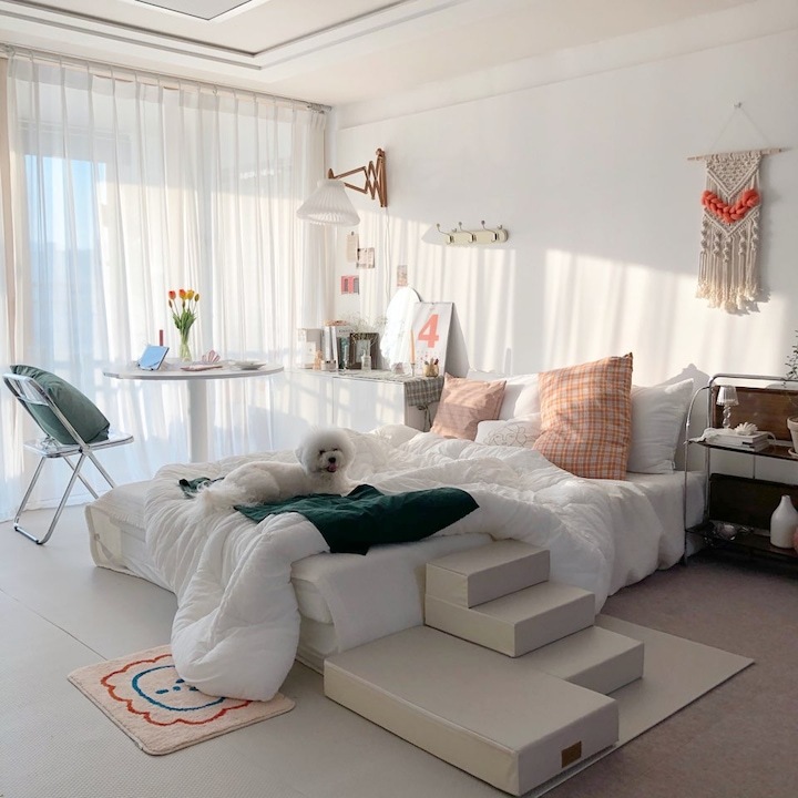 이렇게 거실이 침실이 되니, 제가 주방에서 베이킹할 때도 거실에 있는 남편과 뽀숑이를 바라볼 수 있고, 대화도 더 많아지더라고요 :) 뽀숑이가 뛰어다녀도 안심이고요! 그리고 집에 들어서는 순간 반겨주는 느낌이 정말 아늑해졌어요. 침대에 바로 눕는 스타일이 아닌데도, 그냥 침대가 반겨주는 모습만으로도 집에 들어서는 순간 느껴지는 안정감이 있더라고요.