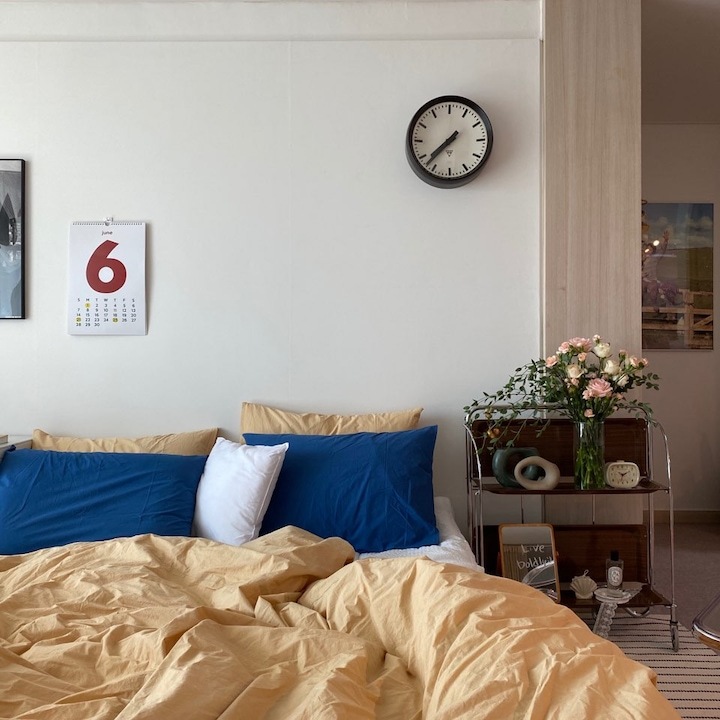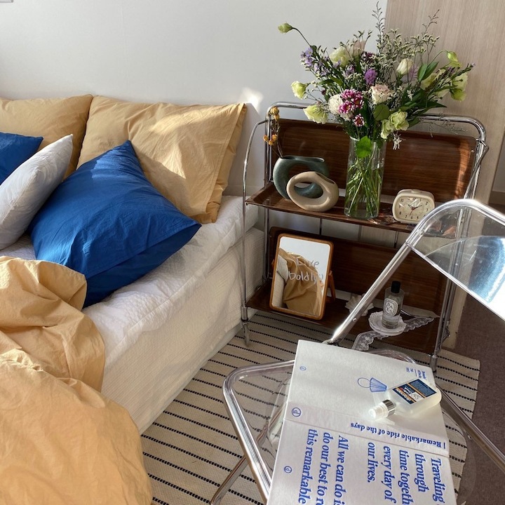 버터 & 라이트 네이비 침구를 쓰고 있는 사진들은 현재의 거실 모습이에요. 이 침구는 '쉐누아파리'에서 제공받은 솔리드 베딩 제품이에요. 후기가 별로 없는 컬러 조합이라 정말 두근거리는 마음으로 기다렸었는데, 도착하자마자 정말 입을 틀어막고 기뻐했었어요. 버터 컬러는 흔한 옐로우나 머스터드가 아니라 묘한 매력이 있었고, 어두운 컬러라 먼지 묻음 걱정을 했던 네이비 컬러는 전혀 그런 현상이 없어요!