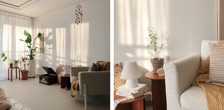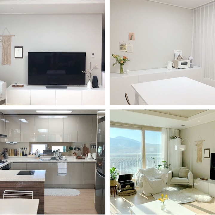 전 집에서 화이트 인테리어가 뭔가 차갑고 휑하다고 느꼈었는데, 그래도 화이트가 주는 화사함을 포기할 수가 없는 것 같아요. 그래서 화이트를 베이스로 하되 안락하고 포근한 느낌을 주려면 어떻게 해야 할지 많이 고민하고 꾸몄던 모습이에요.