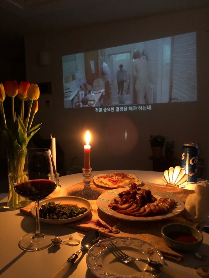 가끔 제 공간에 남편을 초대(?)해서 홈파티를 즐기기도 해요. 이때도 역시 침대 맞은편은 홈시네마를 즐길 수 있게 비워뒀기에, 간단한 안주와 술을 준비해서 술이 있는 홈시네마를 연출하죠. 뽀숑이가 가족이 되고 거의 영화관을 가지 않는데, 저는 오히려 집에서 좋아하는 음식과 뽀숑이와 함께 영화를 즐길 수 있어서 더 좋은 것 같아요.