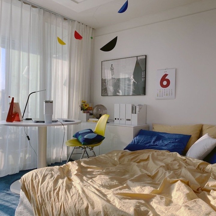 이 사진을 찍었을 때쯤부터 알록달록한 소품을 들이는데에 재미를 붙이기 시작한 것 같아요. 컬러감 통통 튀는 모빌을 달고, 쨍한 색감의 작은 소품들을 들이기 시작하면서 작업공간이 지루한 공간이 되지 않도록 꾸며갔어요.