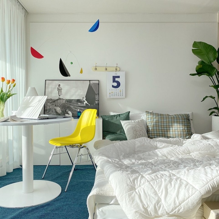 5월쯤에는 포인트 컬러를 그린과 네이비, 옐로우로 바꾸어봤어요. 업무공간은 모던한 컨셉이 되길 바라면서도 집 전체적인 아늑함은 사라지지 않았으면 하는 마음으로 꾸몄어요.
