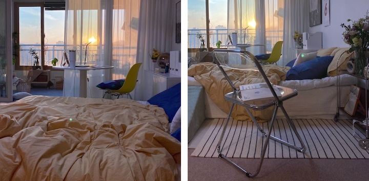 지내면 지낼수록 노을이 지는 시간의 햇살이 너무 마음에 드는 집이에요. 사실 서향이 어둡다는 얘기에 조금 걱정했었는데 기우였더라고요! 앞이 뻥 뚫린 강변이라 그런가 종일 밝은 느낌에, 제가 집에 주로 있는 오후 ~ 저녁 시간엔 햇살이 엄청 들어와서 저희 부부 라이프스타일엔 오히려 잘 맞는 것 같아요.