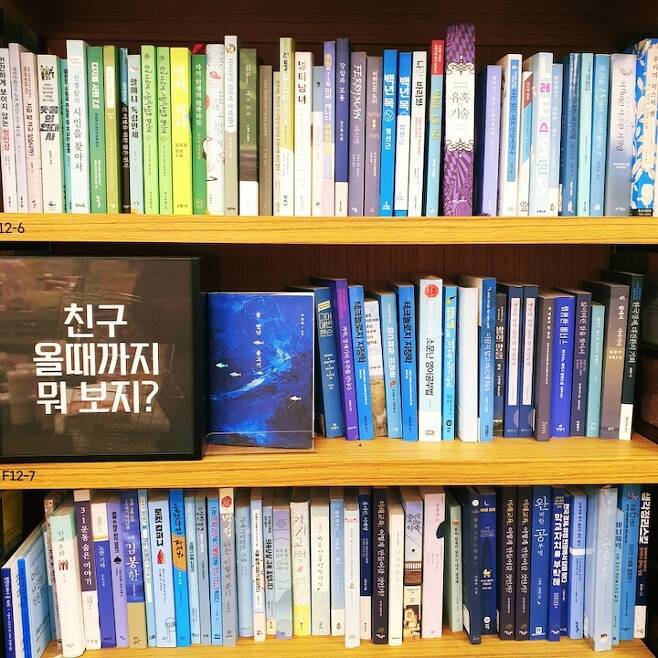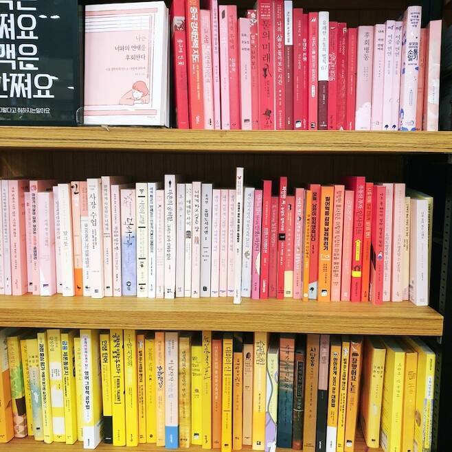 그러면 책의 분야나 높이와는 상관없이 이렇게 책 컬러를 1순위로 정리해도 좋아요. 분야를 모두 뒤섞어서 오직 컬러만 기준으로 책을 진열한 YES24 강남점처럼요!