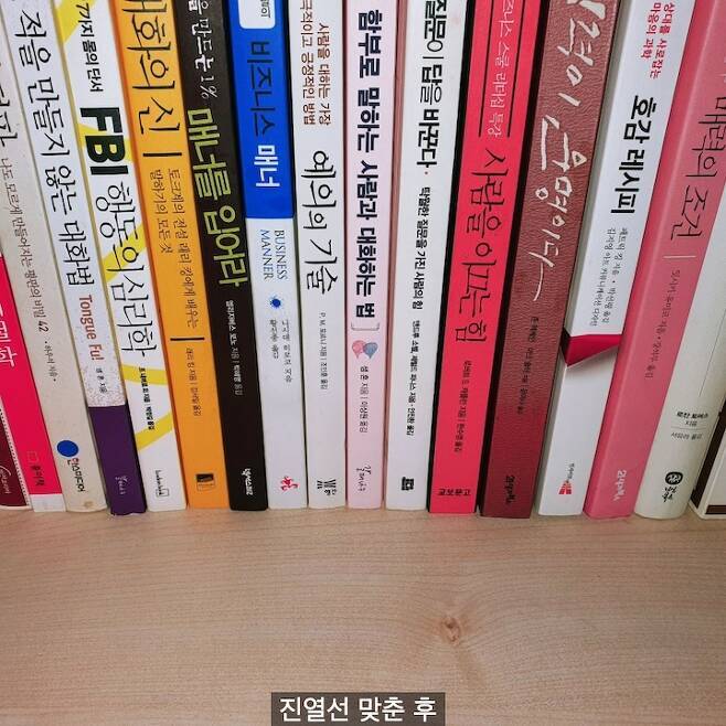 그래서 가장 폭이 넓은 책을 기준으로 앞쪽 책등 진열선을 맞춰 주었더니깔끔해졌어요.