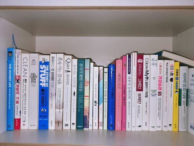 정리수납에는 절대적인 법칙이 없어요. 효율적인 방식이 존재하는 거죠. 제 경험상 [책 분야 > 책 높이 > 책 컬러] 순으로 정렬을 잡는 게 효율적이었어요.