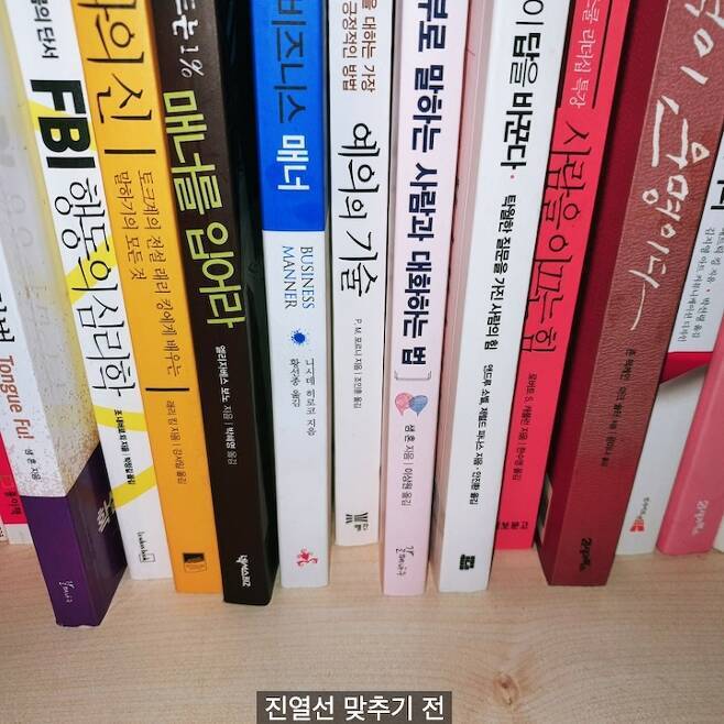 위 사진처럼 책 분야에만 맞춰 꽂다 보면 높이와 컬러가 제각각이 되어 버립니다.