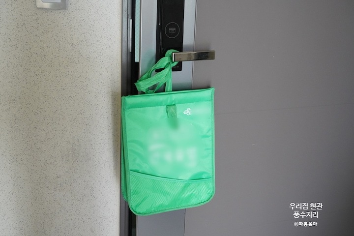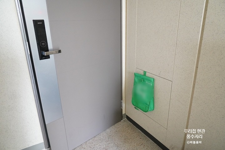 이렇게 옆에 걸어둘 수 있는 공간이 있다면 문에서 바로 옆에 두는 게 좋고, 없다면 한쪽에 작은 박스를 비치해 우유 주머니를 두어도 된다고 하네요.