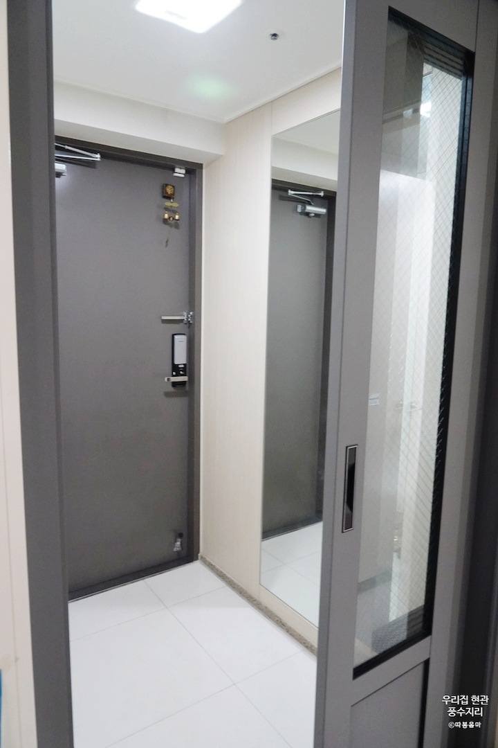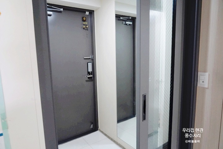 사실 풍수지리에 따르면 현관에 이렇게 큰 크기의 거울이 있으면 좋지 않고, 위치를 바꿀 수 없다면 상반신만 볼 수 있는 크기가 적당하다고 해요 ㅋㅋㅋ