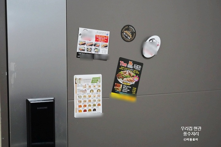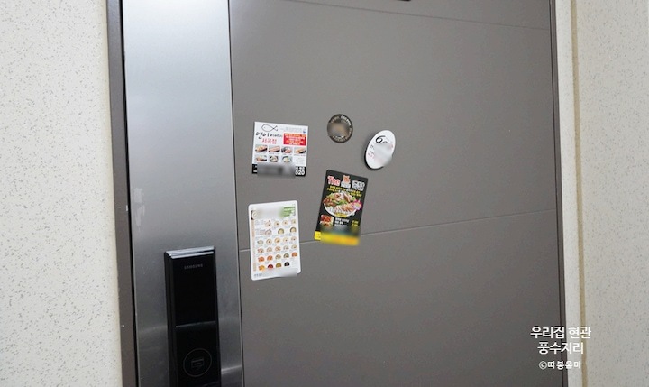 저도 나갔다만 들어오면 우리 집 현관문에 배달음식 스티커부터 부동산 명함 등 참 많이도 붙어 있는 걸 볼 수 있습니다.
