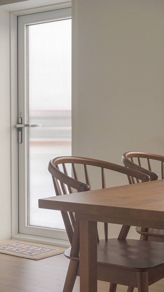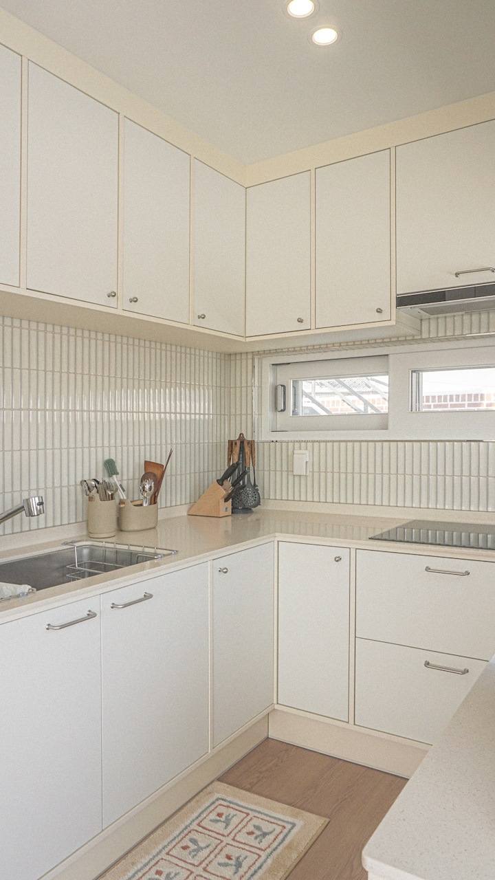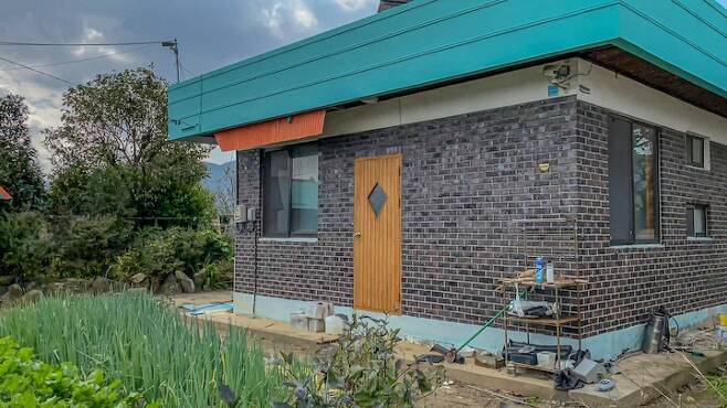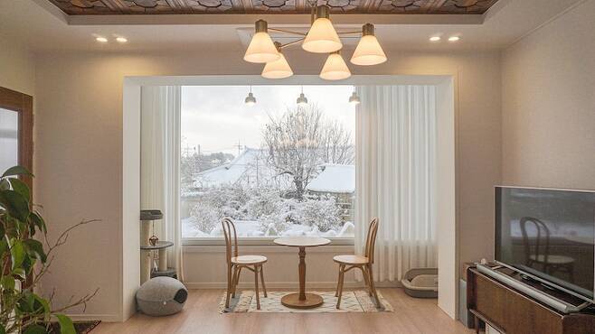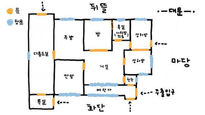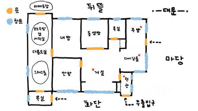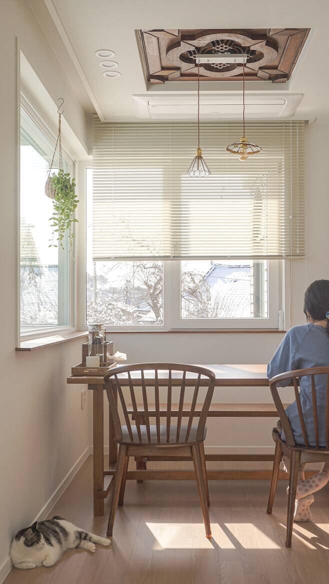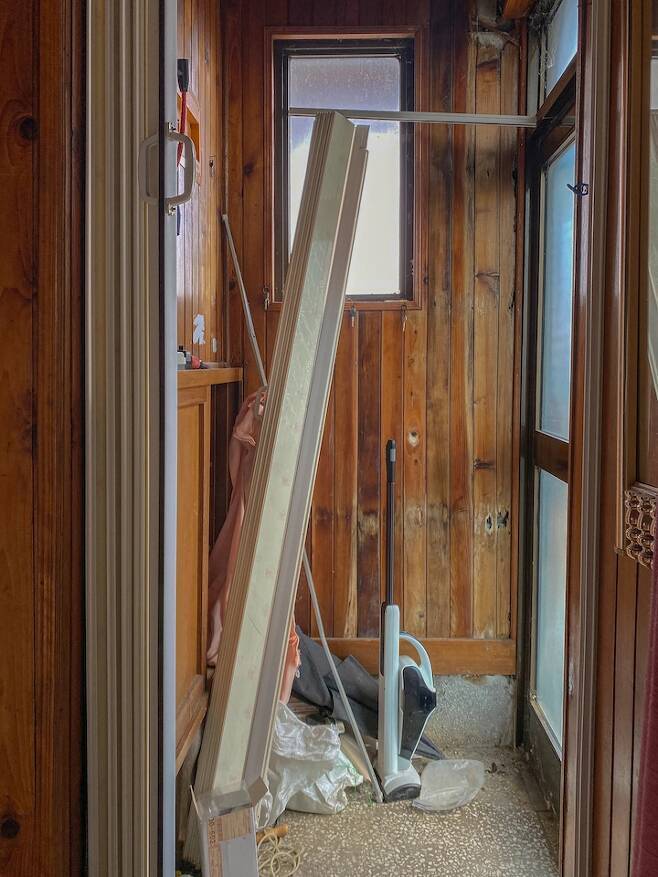 | [before] 우리 집은 정남향에 27평이고, 마당까지 하면 130평이에요. 1985년생 노후주택인 우리 집은 농사를 좋아하시던 집주인 할아버지의 밭과 정미소로 쓰이던 낡은 창고가 있는 넓은 마당, 집으로 들어가는 입구의 아치형 기둥과 세월이 만든 거실의 나무 천장이 인상 깊던 곳이에요. 이전에 살던 집은 집주인이 들어와 살겠다고 해서 쫓겨나 급하게 구한 곳이지만, 면 소재지라 편의시설도 있고(무려 편의점..!) 아빠 농장도 가까우며, 무엇보다 강아지들이 놀 수 있는 넓고 안전한 마당이 정말 마음에 들었어요. 공사는 반 셀프로 진행했어요. 디자인 및 자재 셀렉을 하면 인테리어 업체를 하시는 아빠의 지인분께서 시공기사님들을 연결해 주셨답니다. 그 외의 마당 공사나 나무 칠 같이 저희가 할 수 있는 부분은 최대한 직접 하면서 인건비를 조금이라도 덜고자 했어요. *도면 - before *도면 - after 거실 앞 베란다를 확장하고, 주방의 위치를 옮겨 옆에 다이닝룸을 만들기로 했어요. 작은 욕실을 더 좁아 보이게 한 다락방도 허물었어요. 주방과 다이닝룸의 창을 키우거나 새로 뚫어서 언제든 마당을 내다볼 수 있도록 설계했어요. 집을 고치면서 가장 중요하게 생각한 건 첫째도 단열, 둘째도 단열, 셋째도 단열이었어요. 시골집은 도시와 다르게 바람을 막아주는 건물이 없어서 외풍이 정말 심하답니다. 이번 이사를 마지막으로 부모님께서 정착하여 노후를 보낼 공간이라 돈을 많이 들여서라도 단열에 신경 쓰기로 했어요. 예상보다 집 상태는 훨씬 심각했어요. 단열이 전-혀 되어있지 않은 건물이어서 벽과 천장 전부 뜯어내 단열 작업을 했고, 보일러 배관도 부식돼서 바닥을 허물고 새로 교체했어요. 점점 공사를 진행하다 보니 변수들이 계속 나왔고, 예산은 진작에 초과했답니다.... 그래도 지금 안 하면 나중에 문제가 생길 게 분명해서 할 수 있는 모든 걸 했던 것 같아요. (=전부 다 새로 했다는 이야기) *자세한 내용은 각 위치별 비포 앤 애프터를 보여드리며 설명할게요:) [외관]after 노후주택을 산다는 건 집뿐만 아니라 세월도 함께 산다고 생각해요. 이젠 나오지 않는 마감재나 시간의 흔적들이 바로 이 집의 가치였고, 그걸 최대한 지키고 싶었어요. 가끔 지나가다 오래된 집에 흰색 새시가 끼워져 있는 걸 보면 이질감이 들더라고요. 그래서 외부 새시는 전부 차콜로 통일했어요. 그리고 외부 마감재가 다양한 편이라 도색은 오프 화이트로 심플하게 시공했어요. 마당은 아직 공사가 진행 중이라 많이 지저분해도 감안하고 봐주세요ㅠ.ㅠ 겨울이 끝나면 잔디를 깔 예정이랍니다 :) 중앙의 붉은 벽돌과 아치형 기둥은 이 집을 처음 봤을 때 가장 맘에 들었던 부분이었어요. 그런데 누수가 너무 심해서 기사님들이 기둥 전체를 감싸버리라고 하시는 거예요.. 그래서 엄마랑 함께 무조건 살려달라고 우겨서 전체 방수 작업 후 붉은 벽돌 부분만 스타코 마감을 해서 누수를 잡았어요. 완벽히 살리고 싶었지만 비올 때마다 불안에 떨고 싶지는 않기 때문에 적당 선에서 타협을 했답니다ㅜ_ㅜ 외부로 향하는 문은 전부 터닝 도어를 사용했어요! 가격은 비싸지만 외풍이 전.혀 들어오지 않아서 정말 좋더라고요. 유리는 모루 유리를 써서 개방감을 주면서 프라이버시는 보호할 수 있도록 했어요. 입구를 바꿨기 때문에 문 앞의 계단은 현무암 벽돌을 이용해 아빠가 직접 만드셨어요 [현관] before after 기존에 있던 아치 모양을 그대로 살리느라 목공 기사님들이 애쓰셨어요. 모든 새시는 외부-차콜, 내부-화이트 컬러로 시공했습니다! 신발장 자리는 원래 베란다로 이어진 곳이었는데, 가벽을 세우고 붙박이장을 넣어 신발장으로 사용 중이에요. 신발장 문 안쪽에 거울을 달아 외부는 깔끔하게 보이도록 했어요 옛날 집 치고 층고가 높아서 신발장을 분리했어요. 신발장 앞 층고는 2800, 중문 층고는 2700이랍니다. 현관은 집에 사용된 모든 손잡이는 을지로에 가서 직접 구매해왔어요. 현관 조명을 위해 정말 많은 곳을 발품 팔았지만 결국 인터넷에서 산 조명을 선택했어요. 과하지 않고 무엇보다 저렴하다는 점이 최고의 장점입니다ㅎㅎ(무려 35,000원..!) 전혀 저렴해 보이지 않아서 강력 추천입니다:) 현관에 들어오자마자 '오~신경 좀 썼는데?' 이런 느낌이 들어서 좋아요. 중문 앞에 놓은 페르시안 발 매트와도 잘 어울려요. 타일 줄눈을 화이트로 하면 금방 더러워지고 너무 튈 것 같아서 바닐라 컬러로 시공했어요. [거실]before 색은 집안의 다른 나무들과 톤을 맞추기 위해 직접 오일 스테인으로 칠했어요! 문틀까지 원목으로 하면 틀어짐이 있다고 해서 문틀은 일반 문틀을 사용했어요. 손잡이는 을지로에서 구매했습니다. 저희 엄마는 소파에 드러누워 있는 걸 보기 싫어하셔서 거실에 소파가 없어요. 그 대신 통창 앞에 2인 테이블을 두고 그 위에 펜던트 등을 달아줬어요. 테이블과 의자는 당근마켓에서 구매했습니다! [다이닝룸] before 창밖을 바라보는 걸 좋아하는 고양이를 위해 창문 앞에 목재로 돌출창대를 만들었어요. 마당에서 일을 하고 있으면 여기에 앉아서 저희를 지켜보는 고양이와 눈이 마주쳐요. 이것도 전부 같은 오
