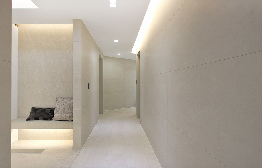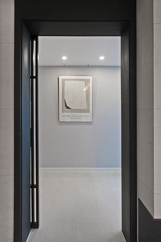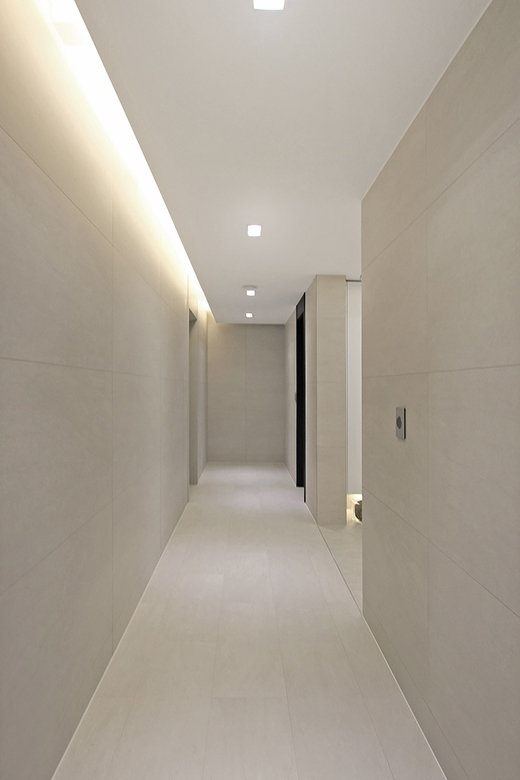 현관과 이어지도록 분위기를 같이 연출한 복도는 마찬가지로 대리석 타일 느낌의 강마루를 사용했습니다. 강마루와 타일로 연출해 아트갤러리에 온듯한 느낌을 주는 공간입니다. 복도도 마찬가지로 은은한 옐로우톤의 간접조명과 매립등을 넣어 대리석의 부드러운 느낌을 더욱 살렸습니다.
