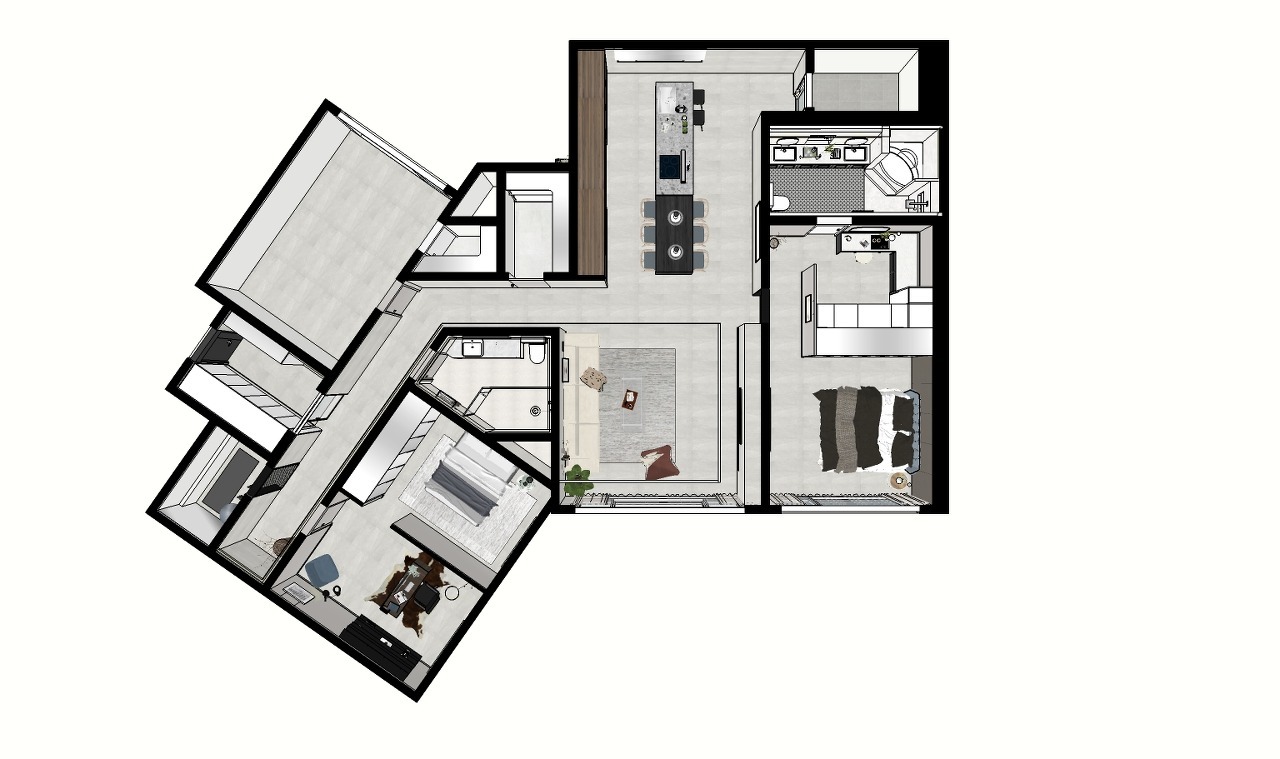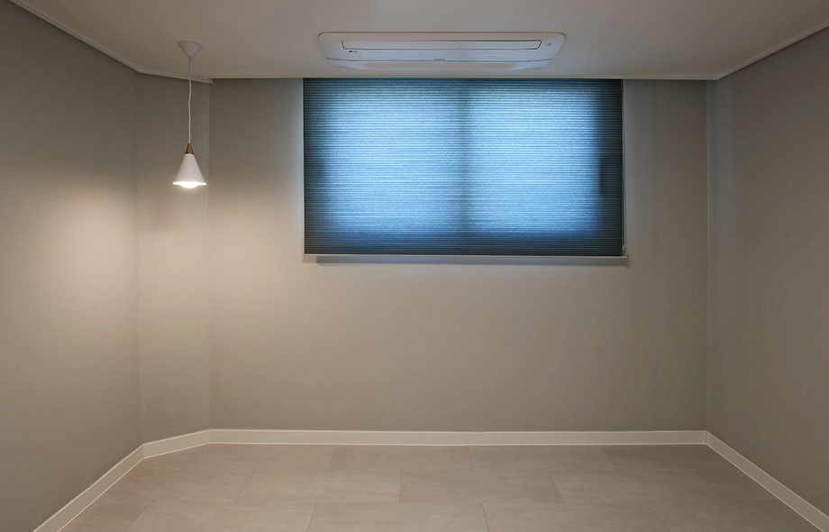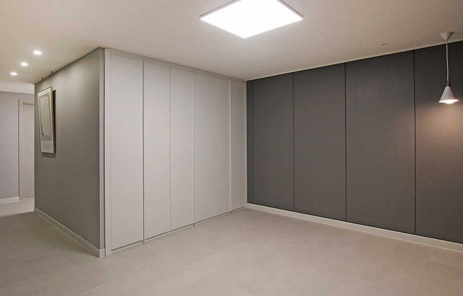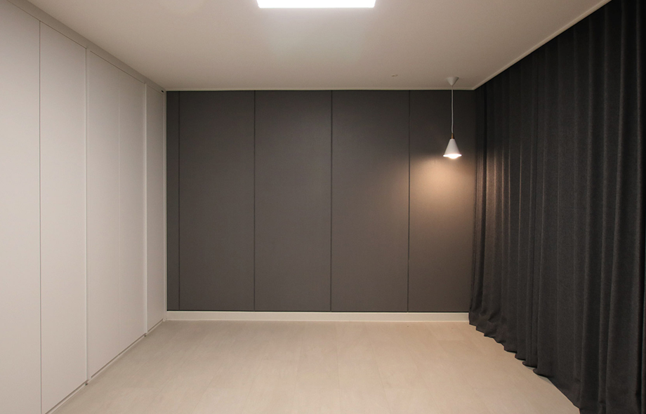 그 외의 작은 방 역시 군더더기 없이 깔끔하게 연출했습니다. 차분한 그레이톤으로 연출하고, 벽쪽에 붙박이장을 설치해 미니멀한 무드를 연출했습니다.