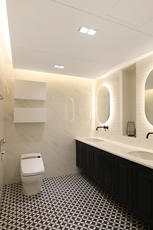 안방욕실은 과감한 패턴의 타일을 사용해 트렌디하게 연출했습니다. 공용욕실과 같이 화이트톤의 서랍장을 넣었고, 세면대와 거울은 거실의 분위기를 이어 블랙앤화이트로 모던하게 투톤연출을 했습니다.