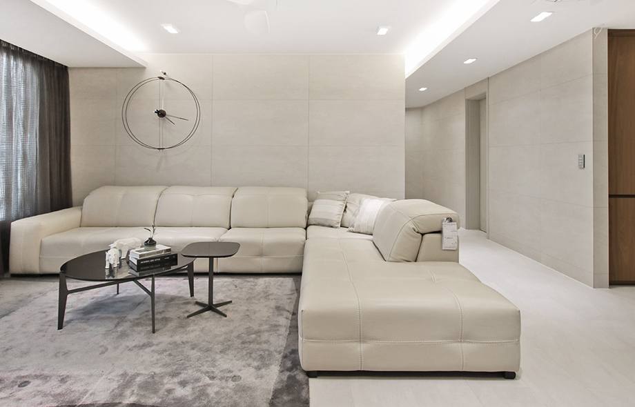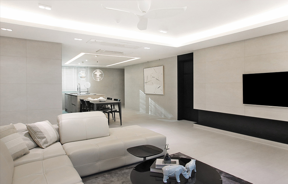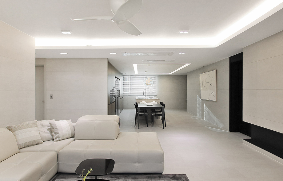 마찬가지로 거실 또한 은은한 간접조명과 매립등을 공간 전체를 감싸주게끔 연출하고 화이트톤 실링팬을 연출해 심미성은 물론 활용도를 높혔습니다.