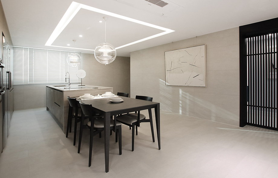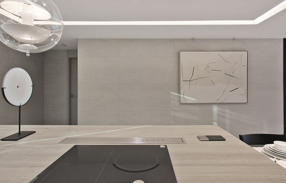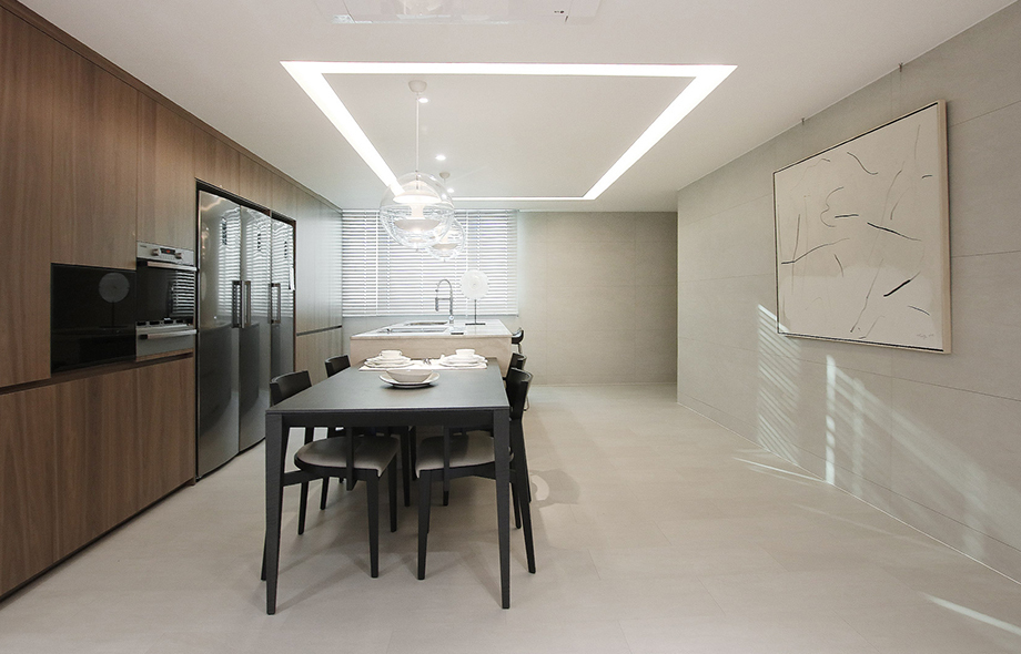식탁을 마주보는 벽면에는 선으로 이루어진 그림을 전시해 전체적인 컨셉인 젠스타일의 무드를 더욱 살렸습니다.