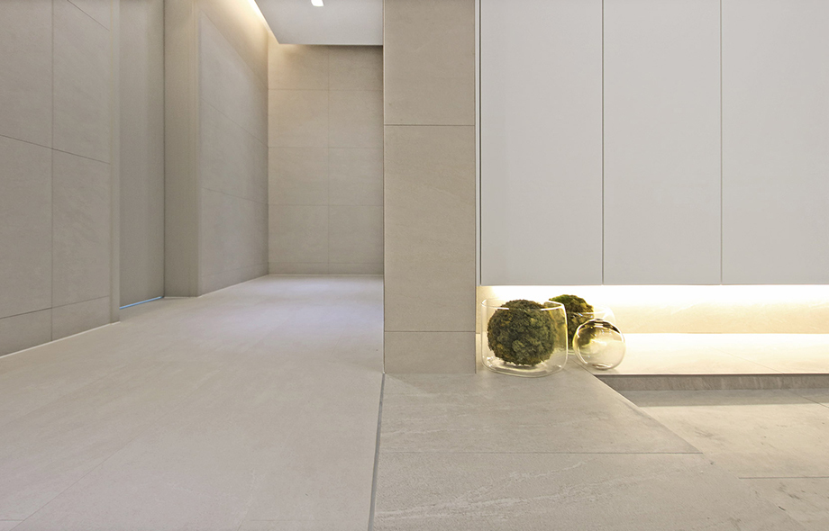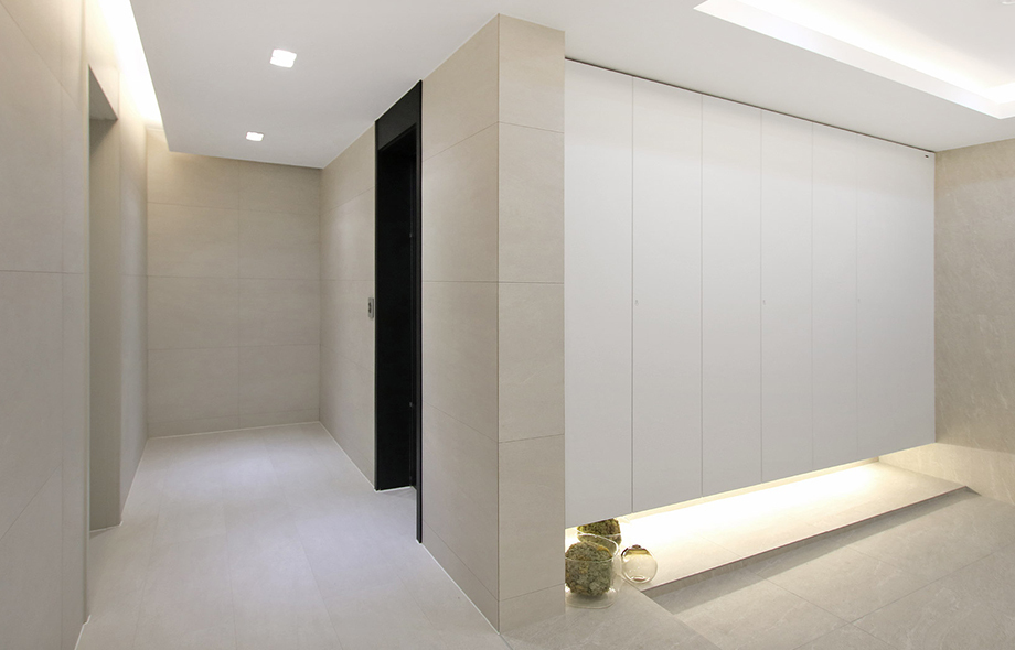 현관으로 들어섰을 때 가장 눈에 들어오는 것은 적절하게 배치한 간접조명과 디테일이 살아있는 포쉐린 타일입니다. 타일은 고급스러운 색감의 밝은 웜그레이 톤으로 연출하고 간접조명이 은은하고 따듯한 느낌을 더해주어 고급스러운 느낌이 드는 현관입니다.