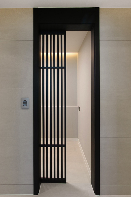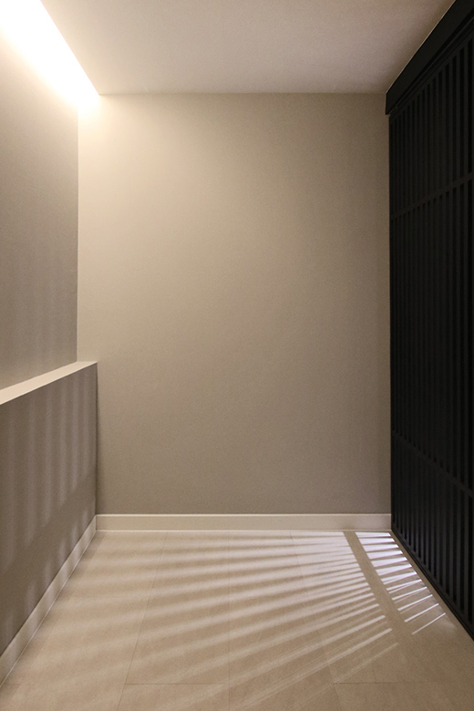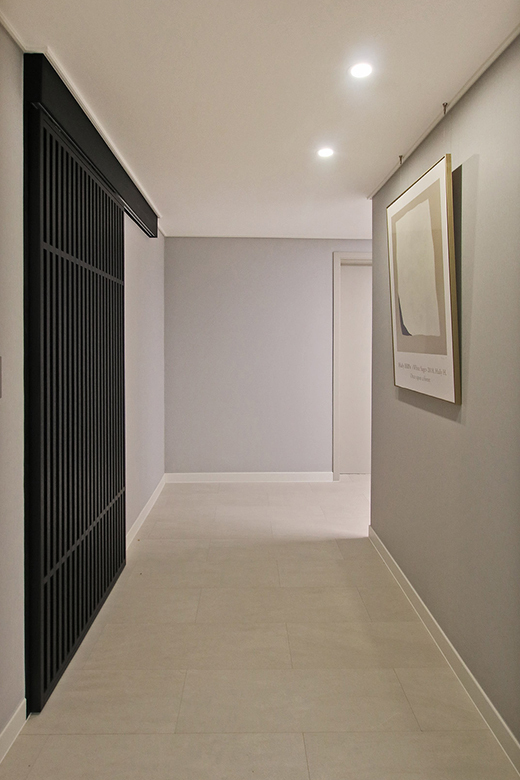 간결하고 정갈한 라인이 살아있는 동양적인 무드의 슬라이딩도어를 연출해 입구부터 차분한 느낌이 드는 복도 공간의 작은 방입니다.