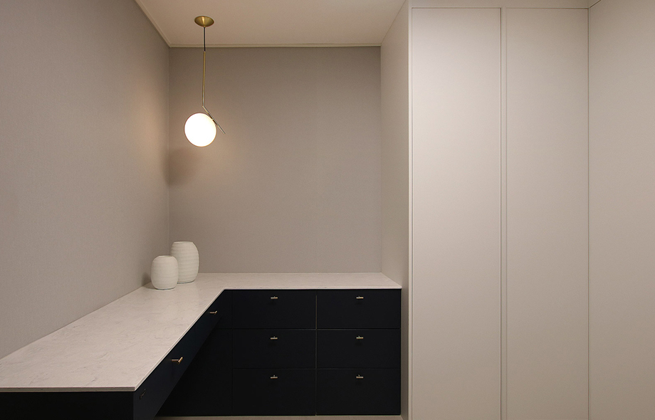 침실 옆 공간에 있는 작은 드레스룸은 짙은 네이비컬러 도어와 골드프레임의 손잡이를 포인트로 준 세련된 느낌의 화장대를 배치했습니다. 또한 골드프레임의 팬던트 조명으로 공간에 분위기를 더했습니다.