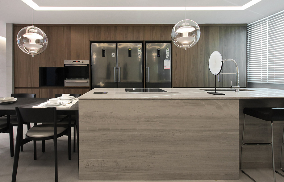 빌트인장과 아일랜드 식탁으로 깔끔하게 연출한 대면형 주방