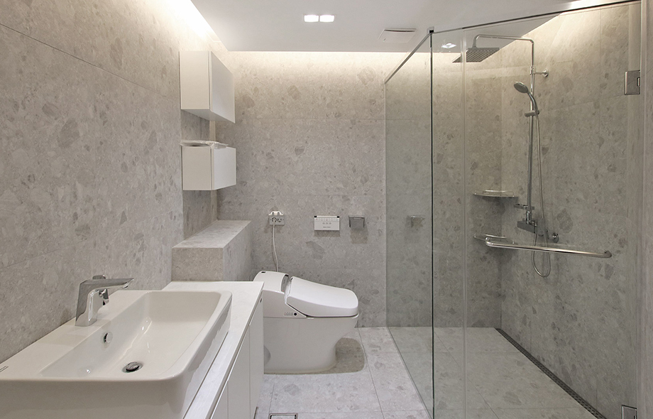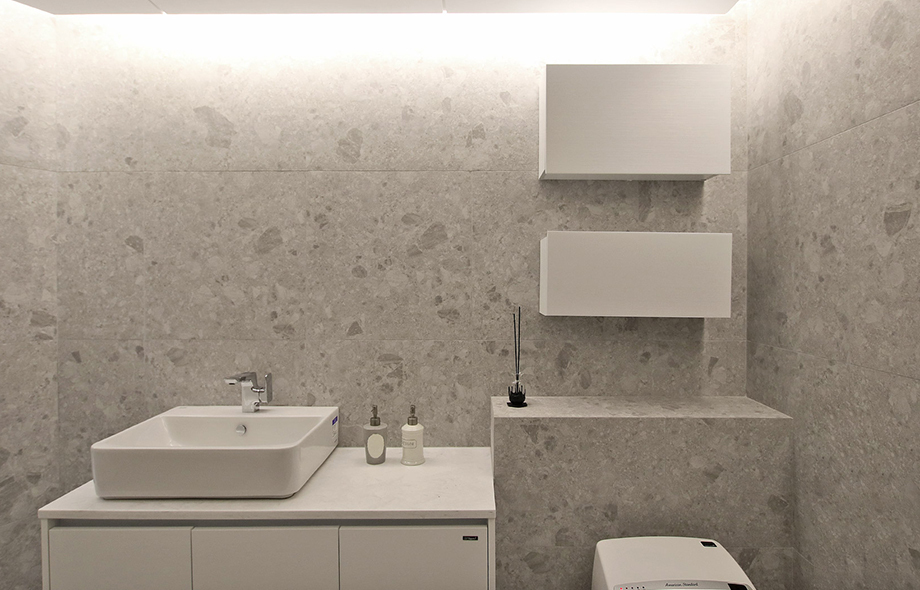 일반적인 직사각형 혹은 정사각형 구조의 욕실과는 다른 독특한 형태를 살려 연출한 공용욕실입니다. 차분한 컬러감과 은은한 패턴이 돋보이는 테라조 타일을 사용하고, 컨셉과 어울리도록 세면대와 모두 화이트로 연출했습니다.