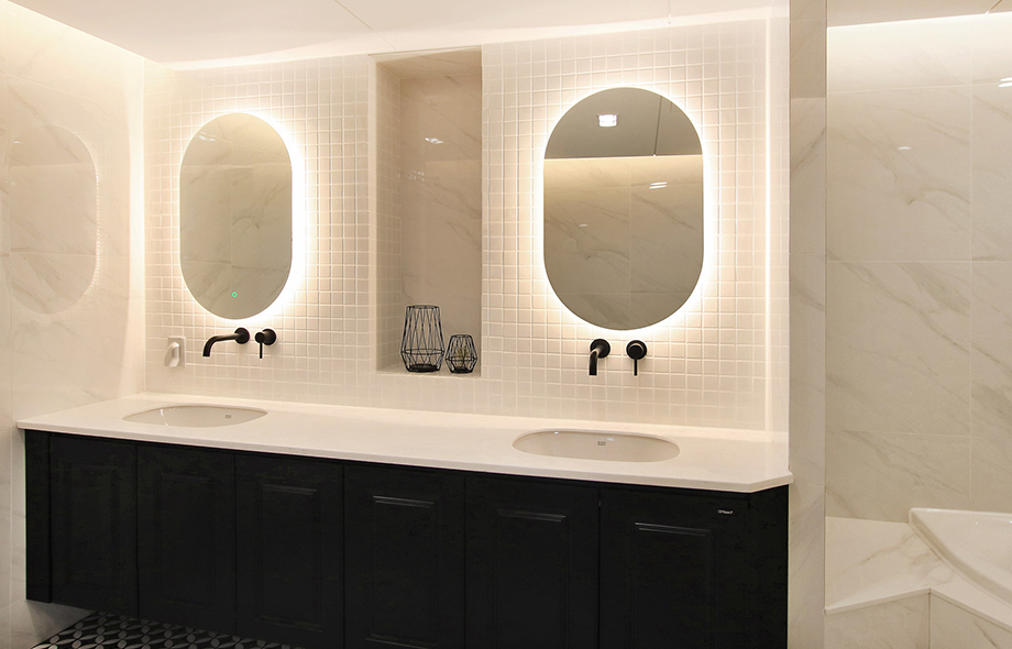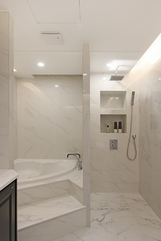 안쪽에는 은은한 패턴의 포쉐린 타일을 이용했습니다. 또한 코너에 욕조를 설치하고, 벽면에는 매립형 수납공간을 연출해 심미성과 기능성 두가지 모두 놓치지 않고 연출했습니다.