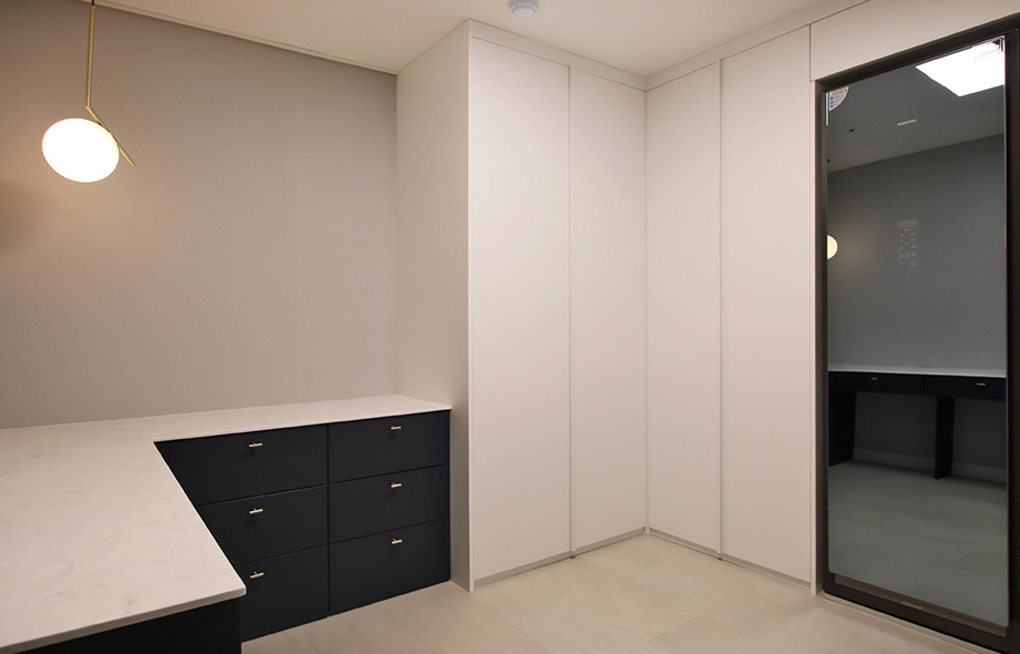 또한 공간을 활용할 수 있도록 붙박이장을 함께 연출해 수납을 용이하게 했습니다