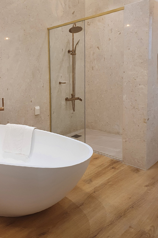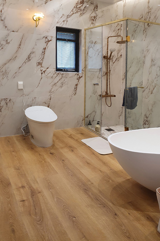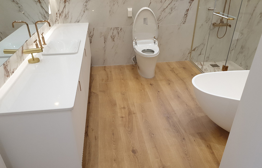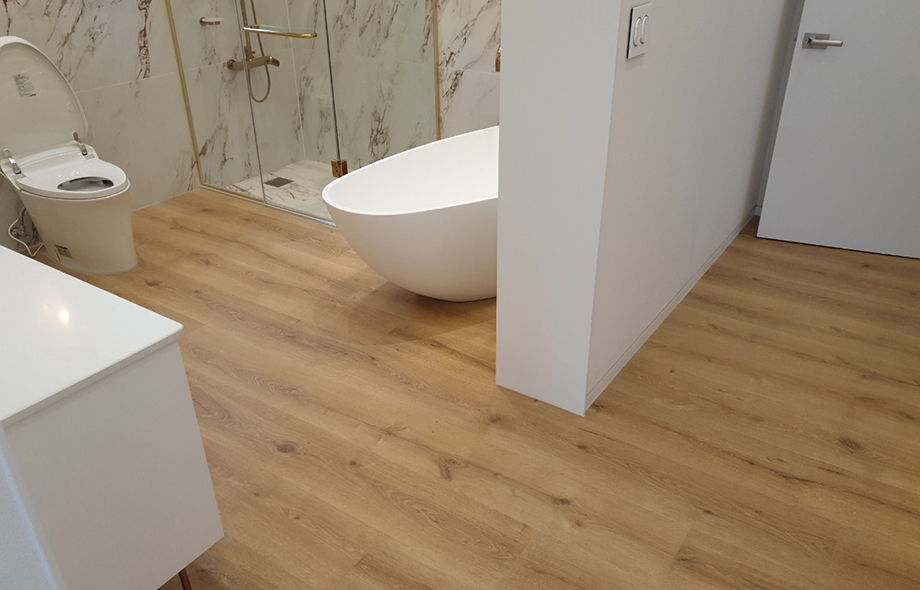환경을 생각한 퀵스텝 하이브리드 마루로 연출한 건식욕실