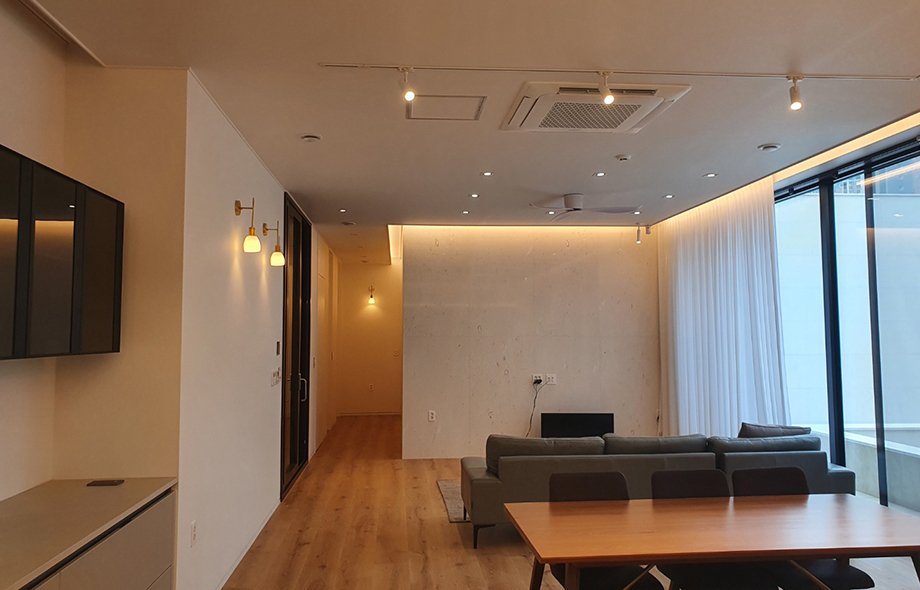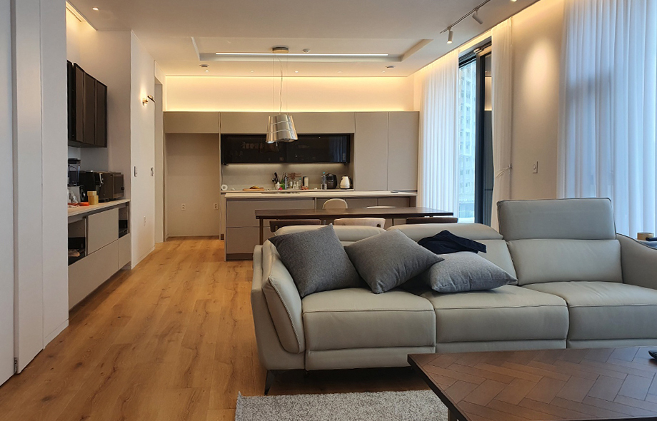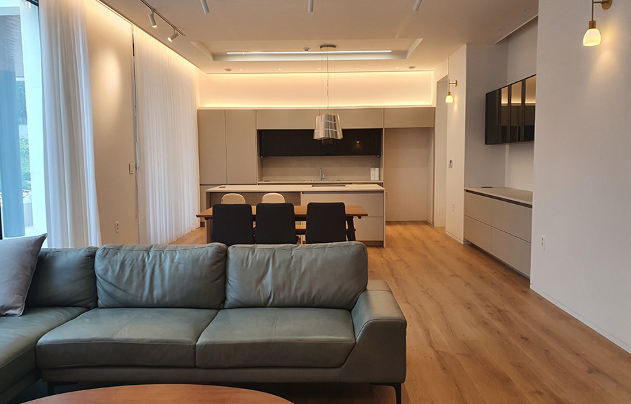 은은한 조명이 감도는 거실과 주방