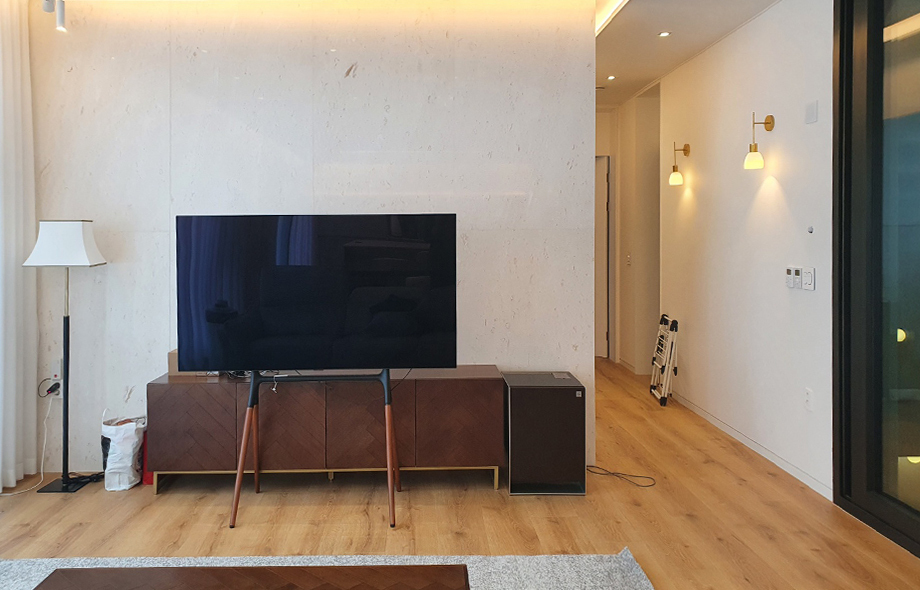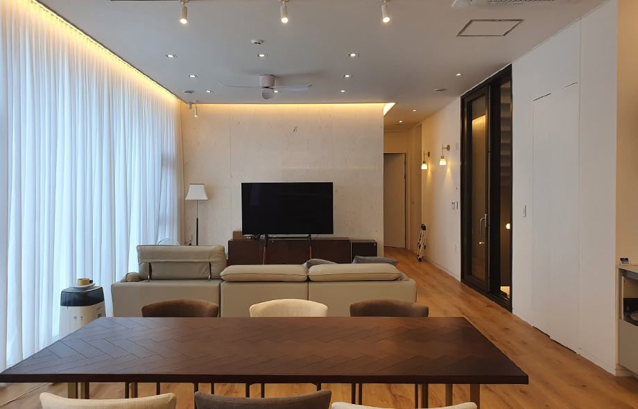 큰 기둥이 자리잡고 있지만 심플한 톤과 마감으로 거슬리지 않고 매립조명으로 깔끔한 천장을 연출한 거실입니다. 적당하게 빛을 차단할 수 있는 커튼과 폭이 큰 마루로 마감해 공간의 개방감을 살렸습니다.