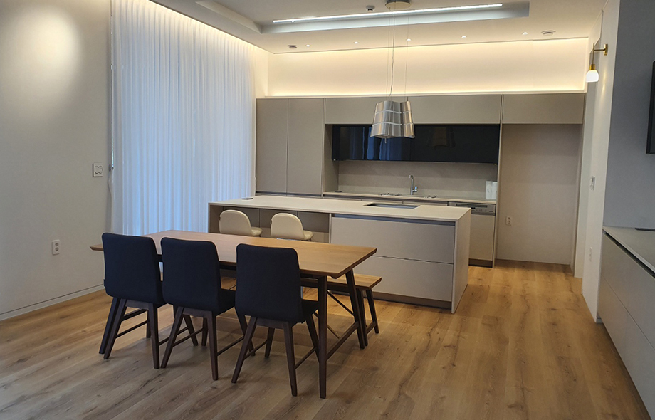 매립조명과 간접조명으로 은은하게 공간을 밝혀주고 주방가구는 모노톤의 심플한 스타일로 마감하였습니다.