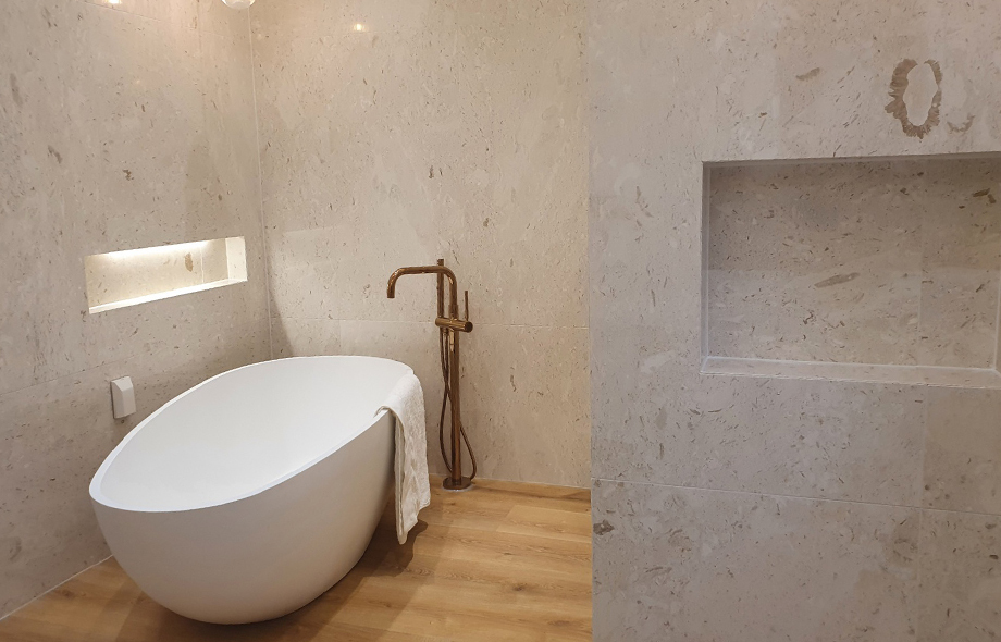 고급스러운 대리석 마감에 바닥은 마루로 마감하였고 그 위에 독립욕조를 두어 외국 잡지에서 볼 법한 럭셔리한 욕실을 연출했습니다. 사용한 마루는 하이브리드 방수마루이기 때문에 욕실에도 사용할 수 있습니다. 브론즈 수전과 하얀 욕조 옆은 간접조명으로 멋스러운 선반을 제작하여 공간의 퀄리티를 높였습니다.