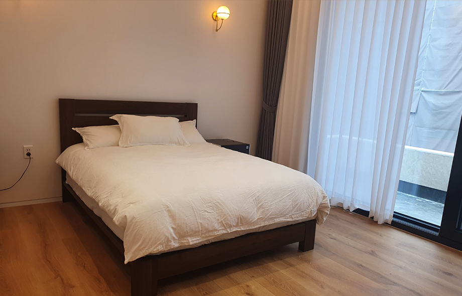 역시 심플한 톤과 마감으로 연출한 침실은 짙은 컬러의 침대프레임과 협탁을 두어 무게감을 주었습니다.