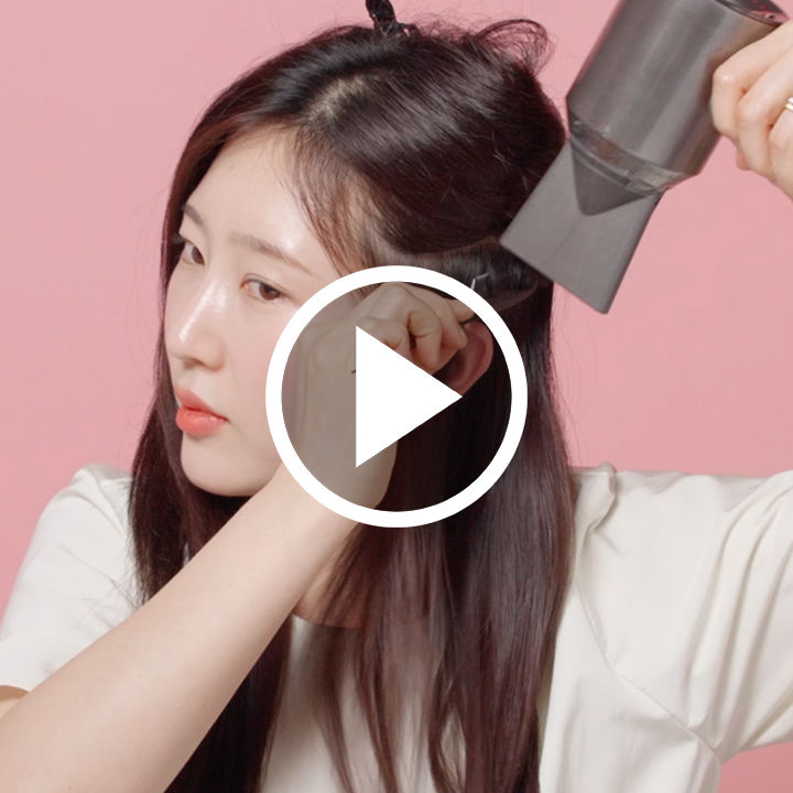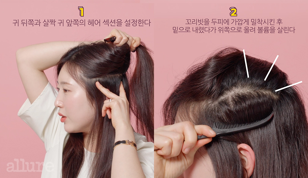 일단 볼륨 살릴 구역을 설정하는 게 가장 중요! 귀를 중심으로 뒤쪽 볼륨을 살리는 게 포인트예요. 머리 볼륨 끝 부분이 광대에서 멀어질 수록 얼굴은 더 작아보이고 숱이 더 많아보이기 때문이죠.