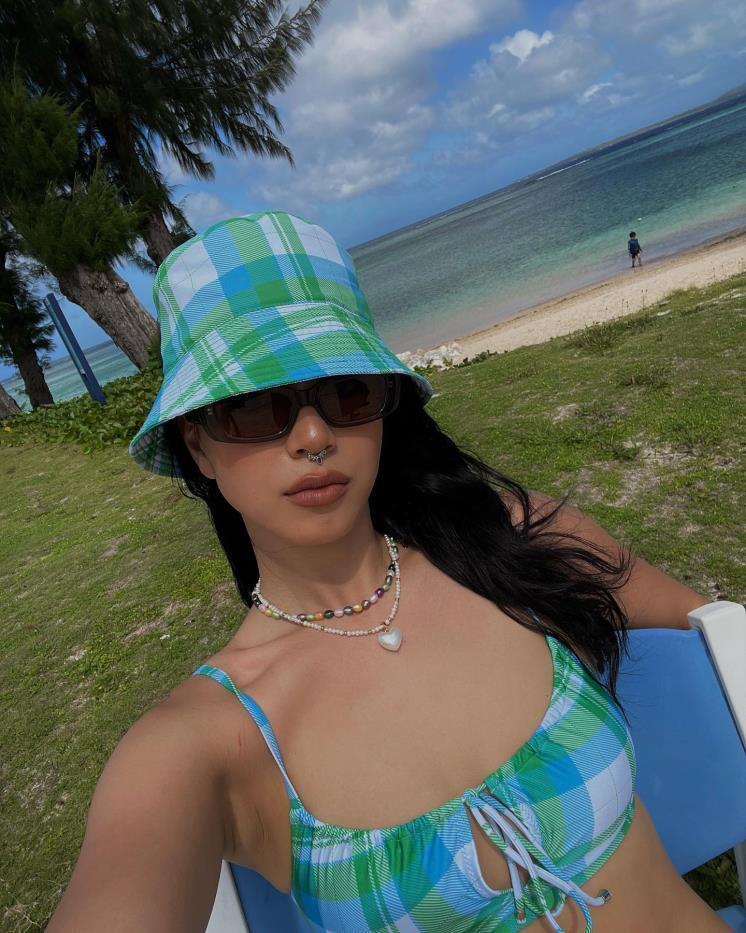 수영복 위에 셔츠 레이어드 스타일링이 아쉽다면, 모델 요요처럼 수영복 하의에 스커트나 숏팬츠를 매치해 보자. 셔츠보다는 살이 조금 더 보여 여름 무드가 더 물씬 풍긴다. 물에 풍덩 뛰어들고 싶을 땐, 하의를 벗기만 하면 OK~ 수영복 패턴과 동일한 버킷햇과 선글라스를 더해도 좋다.