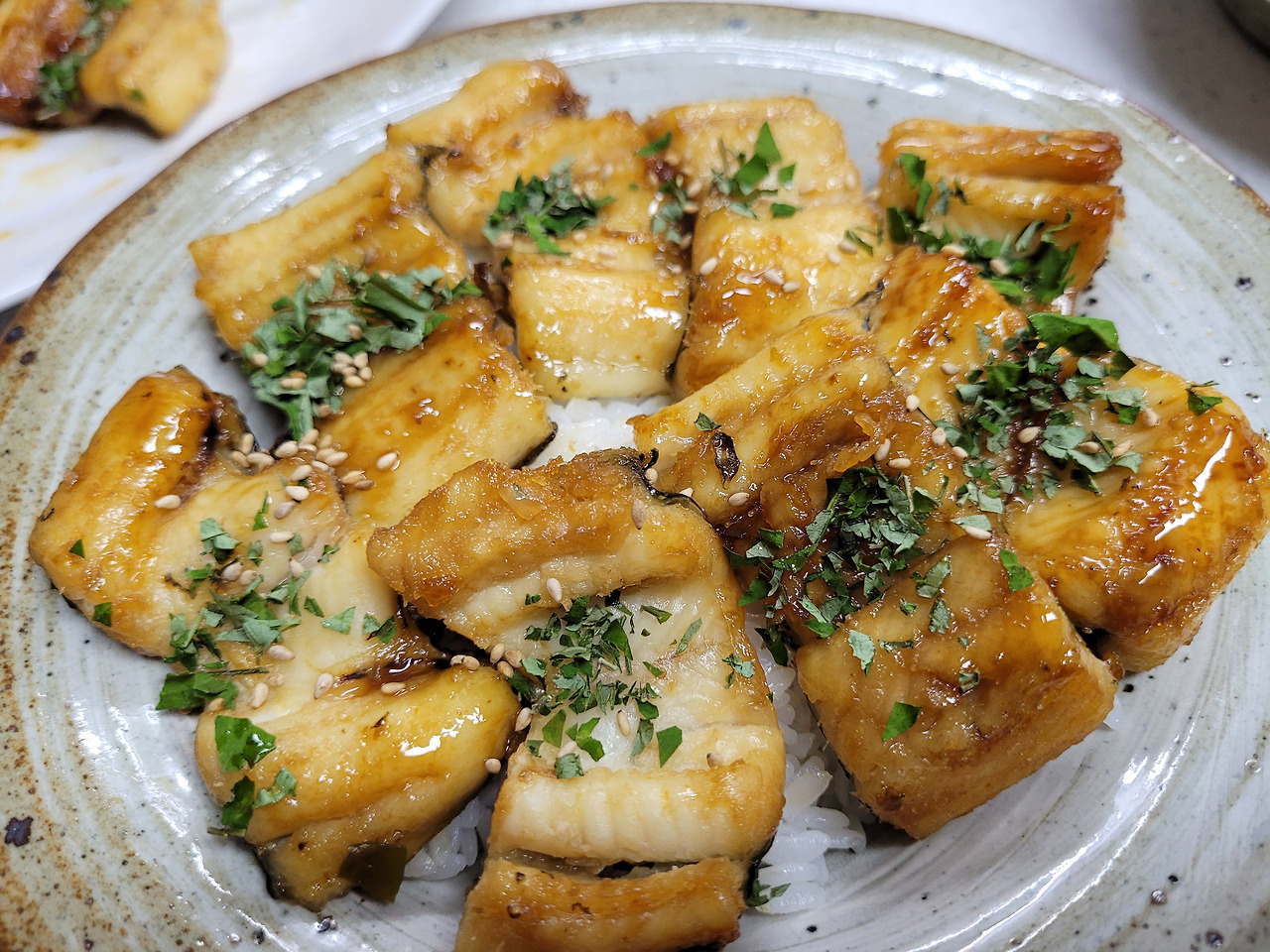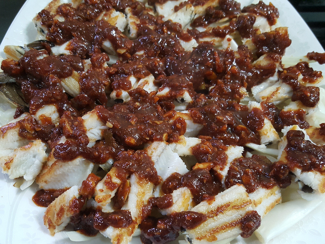 양파위에 구운장어 올리고 남은소스 뿌려줍니다~