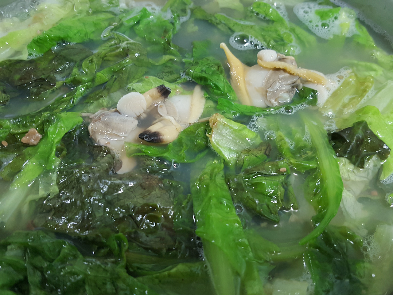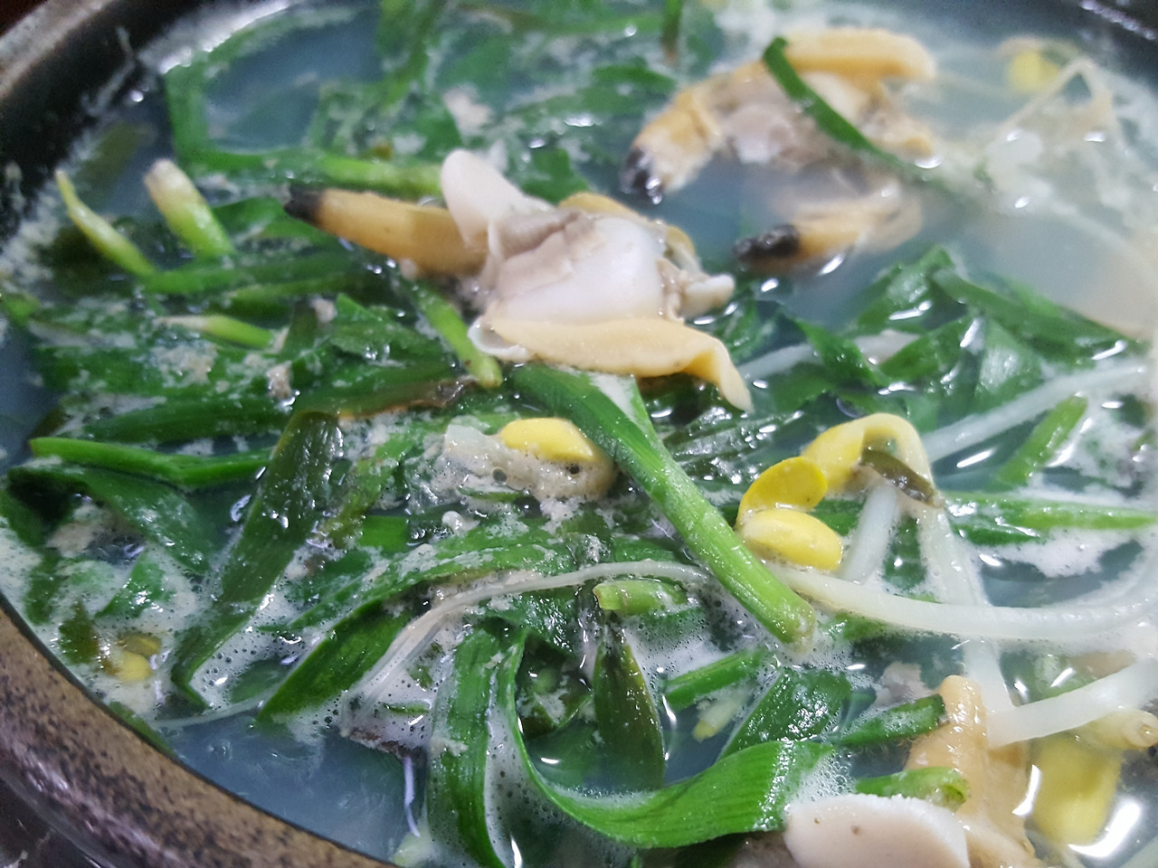 다시마우린 물에 끓으면 바지락 넣고 또 끓으면 부추넣어 마무리합니다~