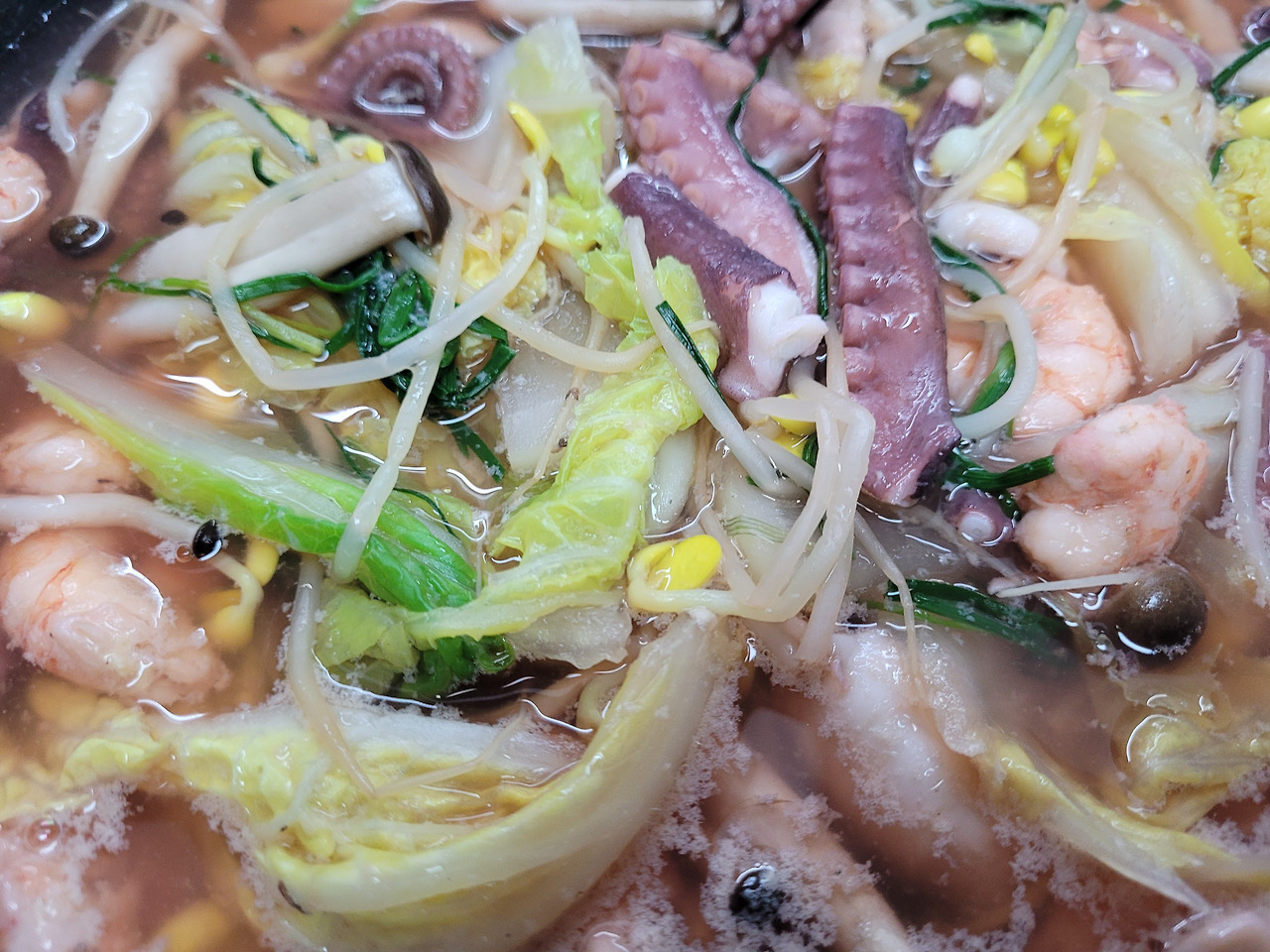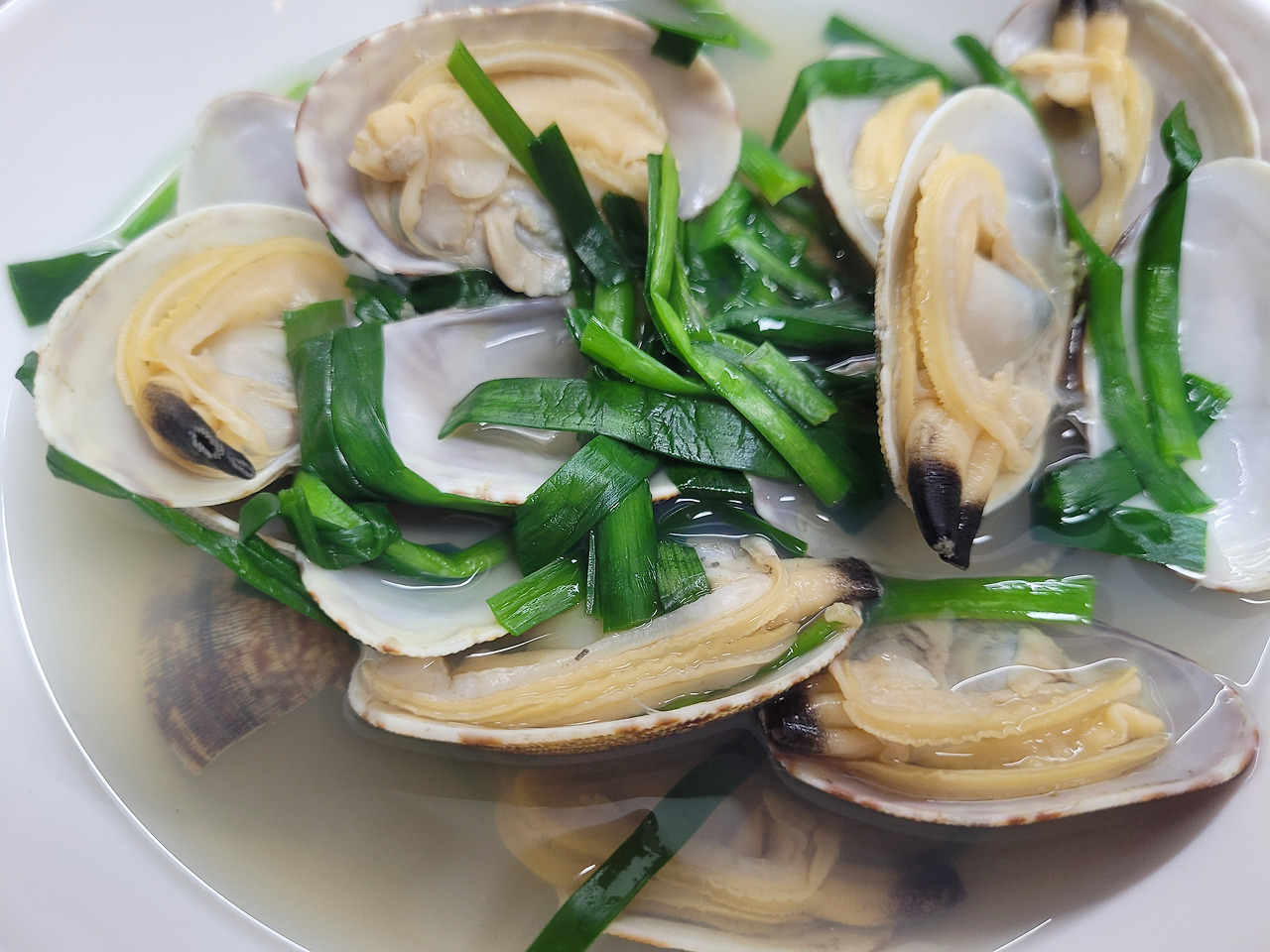 다시마우린 물에 끓으면 바지락 넣고 또 끓으면 부추넣어 마무리합니다~
