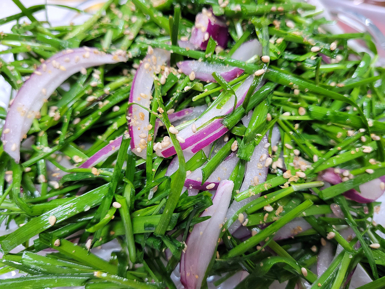 부추를 소금과 식초 매실액으로 무쳤습니다~
