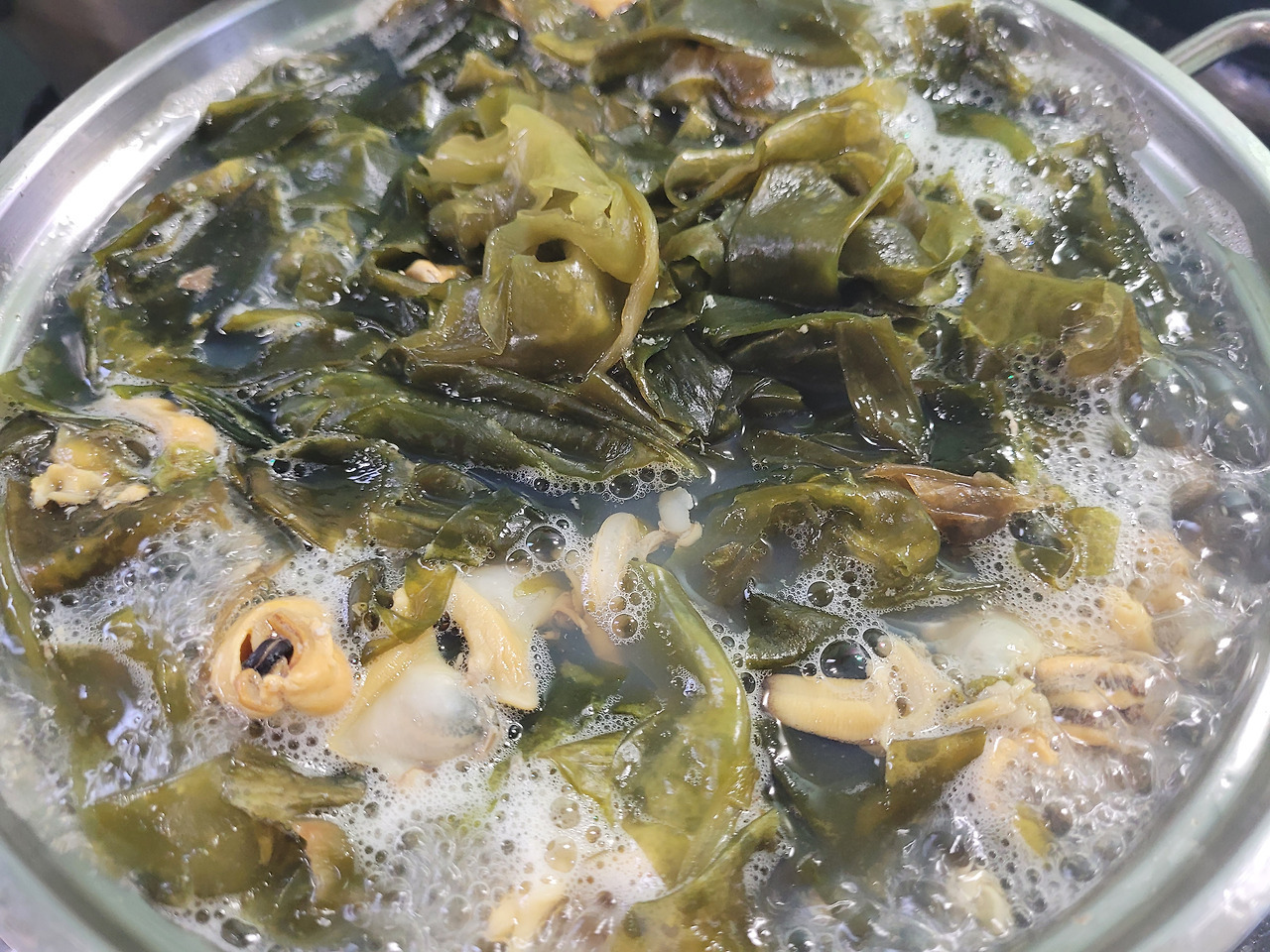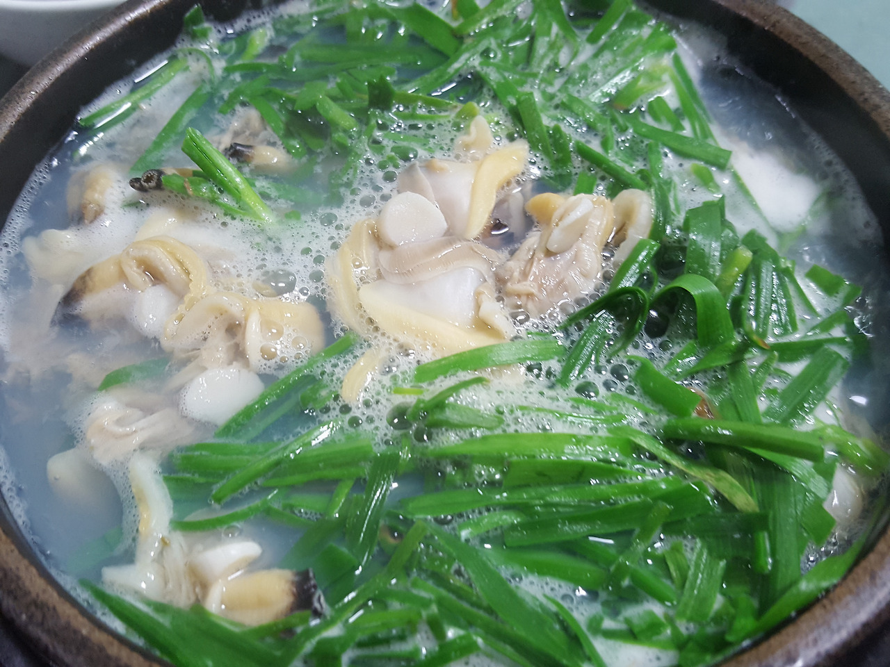 다시마우린 물에 끓으면 바지락 넣고 또 끓으면 부추넣어 마무리합니다~