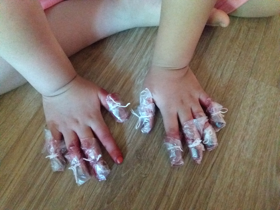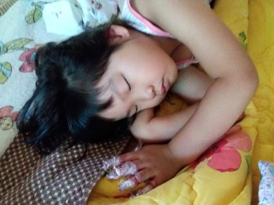 열손가락을 꽁꽁 묶어주었더니 답답하다고 한참이나 보채다가 겨우 잠이 들었습니다.