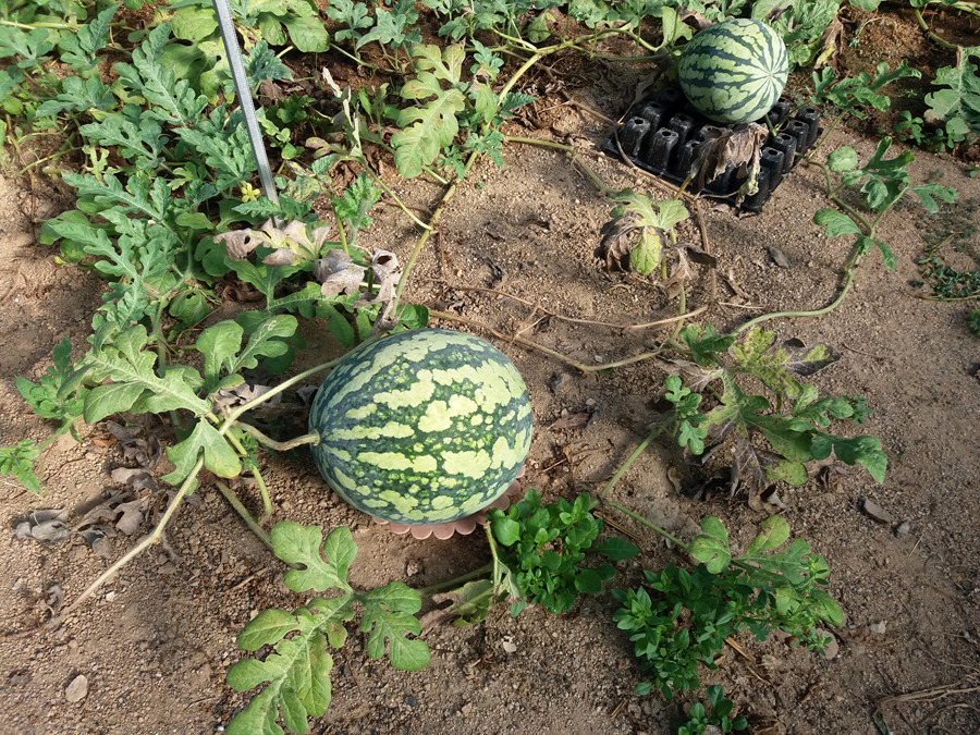 아내가 일심으로 물을 준 수박 다섯 덩이가 잘 자랐습니다.