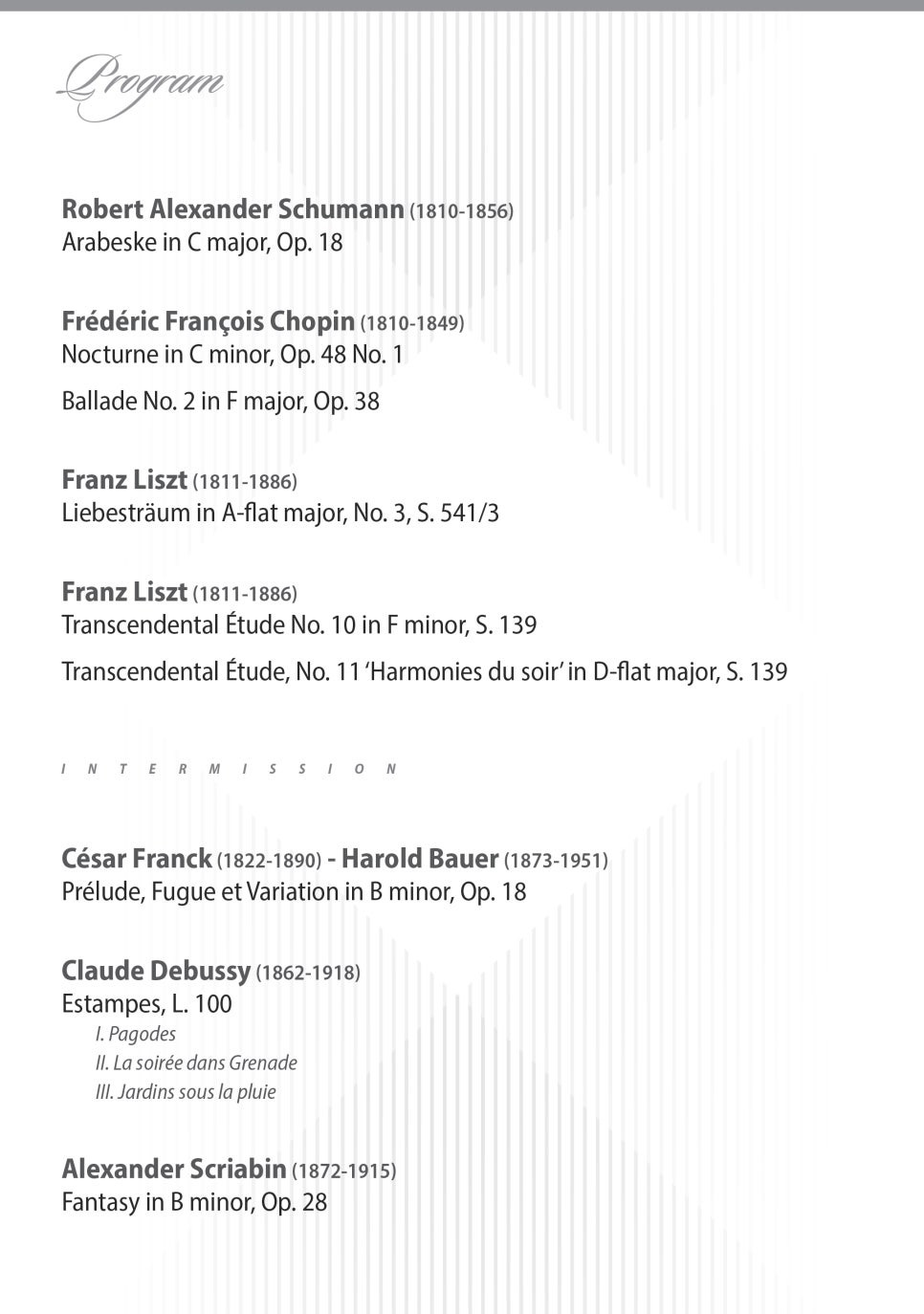 이번 독주회는 낭만주의를 중심으로 인상주의, 그리고 초기 현대음악으로 넘어가는 과도기에 이르기까지 폭넓은 시대와 스타일을 아우르는 프로그램으로 구성되어 있다. 1부는 독일 낭만주의의 서정성과 시적 감수성을 담은 슈만의 아라베스크로 시작되며, 섬세한 내면의 감정이 돋보이는 쇼팽의 곡과 풍부한 감정 표현과 회화적 묘사가 특징적인 리스트의 작품을 통해 비르투오소적인 음악 세계를 선보인다.