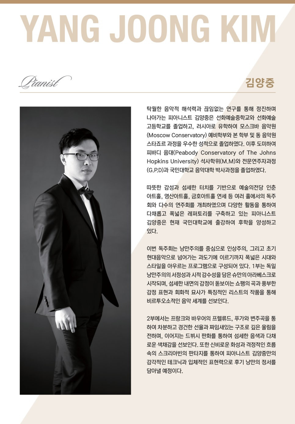 따뜻한 감성과 섬세한 터치를 기반으로 예술의전당 인춘아트홀, 영산아트홀, 금호아트홀 연세 등 여러 홀에서의 독주회와 다수의 연주회를 개최하였으며 다양한 활동을 통하여 다채롭고 폭넓은 레퍼토리를 구축하고 있는 피아니스트 김양중은 현재 국민대학교에 출강하여 후학을 양성하고 있다.