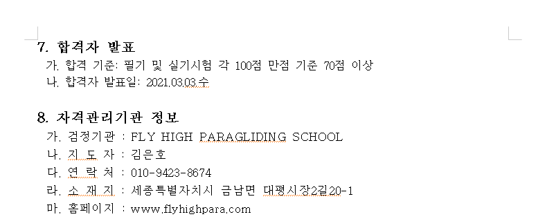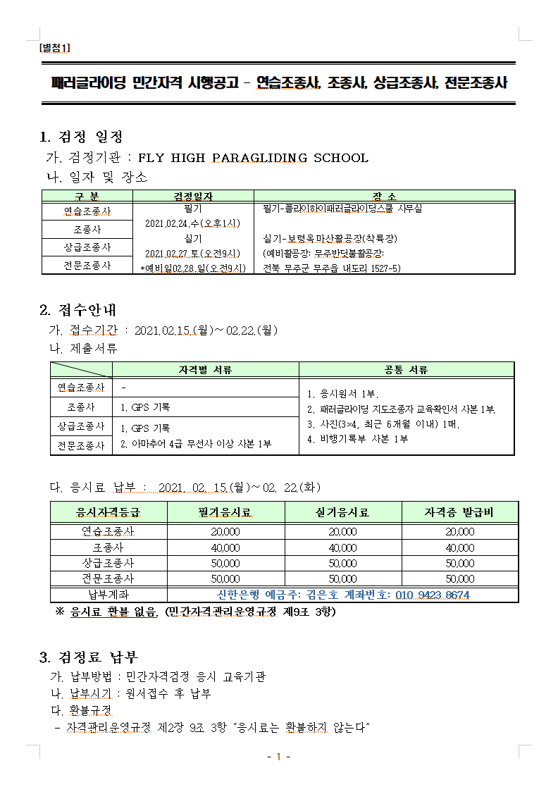 [스크랩] 2021년 제1차 민간자격검정 공고-FLY HIGH PARAGLIDING SCHOOL 작성자FLY HIGH|작성시간21.02.14|조회수11 목록 댓글 0 글자크기 작게가 글자크기 크게가 별첨1. 민간자격검정 공고 양식 (1)60.50KB별첨2. 응시원서 양식 (1)13.50KB별첨3. 교육확인서94.50KB별첨4. 책임면제와 위험가정 동의서 양식18.50KB 첨부파일첨부된 파일이 6개 있습니다. png 파일 20210214_191712.png 다운로드 png 파일 20210214_191517.png 다운로드 hwp 파일 별첨2. 응시원서 양식 (1).hwp 다운로드 hwp 파일 별첨1. 민간자격검정 공고 양식 (1).hwp 다운로드 hwp 파일 별첨3. 교육확인서.hwp 다운로드 hwp 파일 별첨4. 책임면제와 위험가정 동의서 양식.hwp 다운로드 다음검색 스크랩 원문 : FLY HIGH PARAGLIDING SCHOOL 현재 게시글 추가 기능 열기 북마크 공유하기 신고 센터로 신고 댓글 댓글 0 댓글쓰기 답글쓰기 댓글 리스트