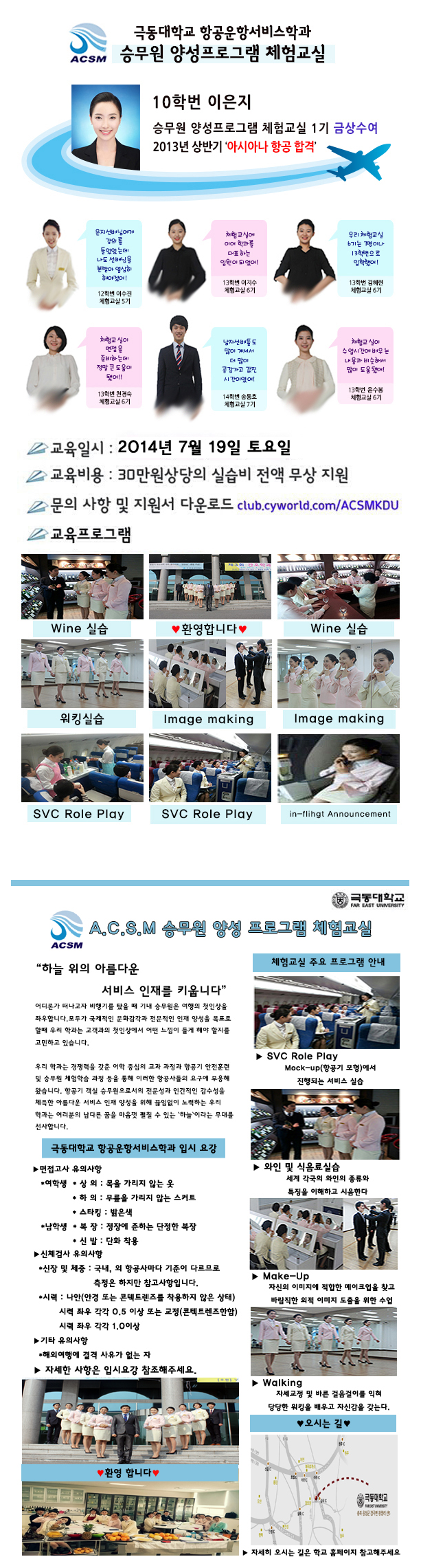 승무원 교육체험교실이란 저희 학과에서는 재학생들이 실제로 배우고 있는 30만원 상당의 학과 과정을 무료로 미리 체험해 볼 수 있는 프로그램 입니다.