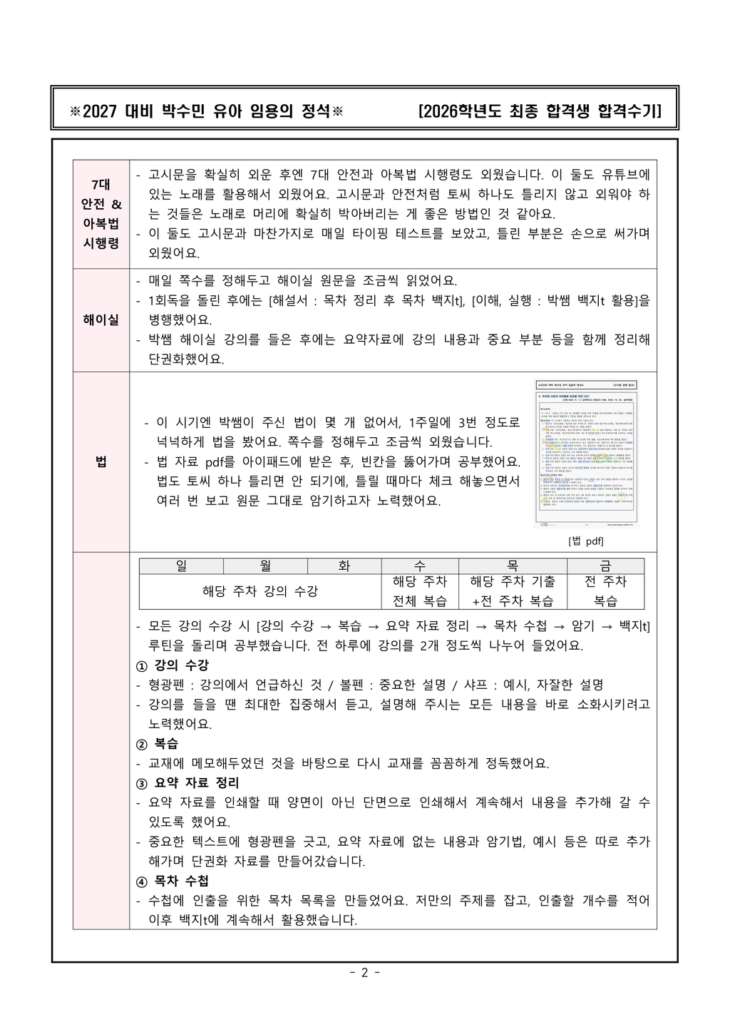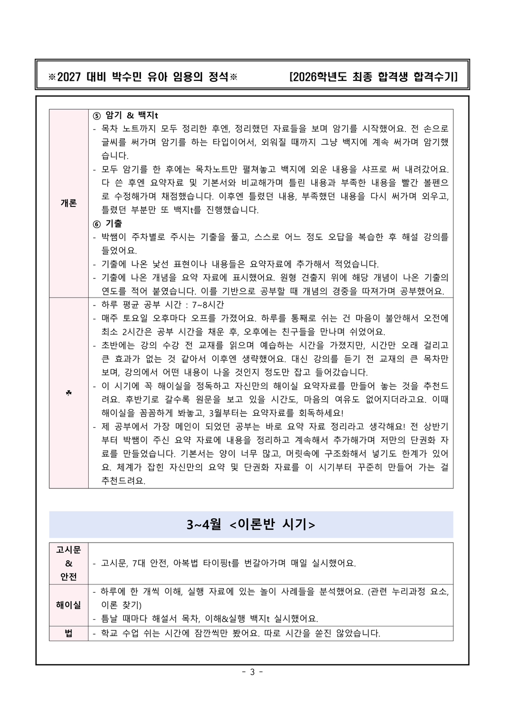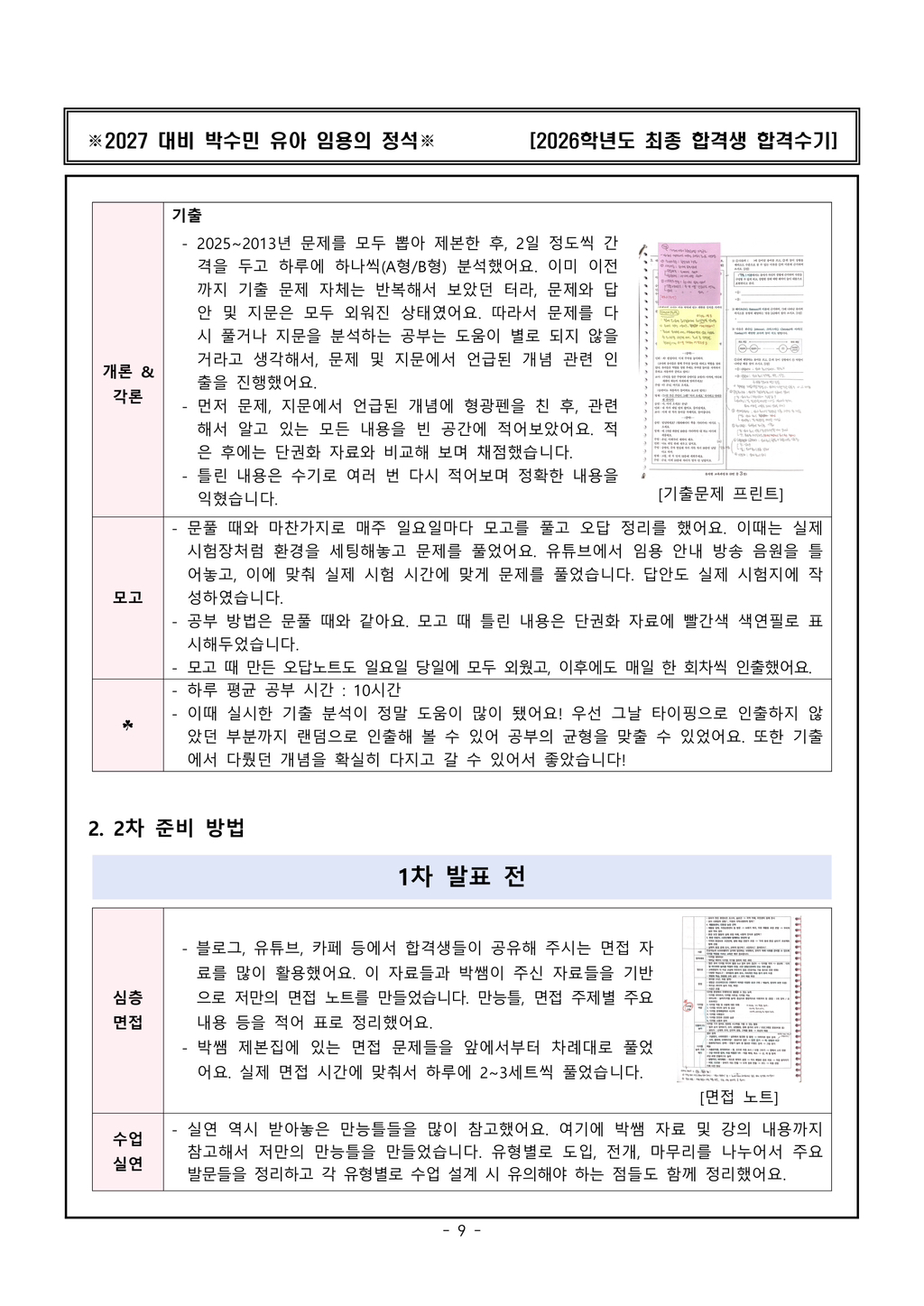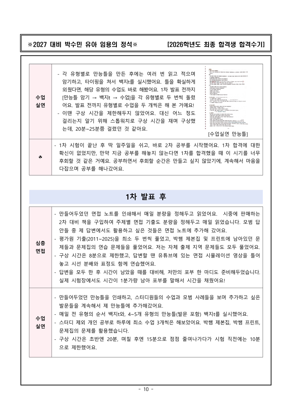 차석(2등) / 초수 / 학부 병행 합격수기 작성자제발꼭합격|작성시간26.02.13|조회수575 목록 댓글 0 글자크기 작게가 글자크기 크게가 안녕하세요 ☺️평가원 지역(전북)에 차석으로 합격하게 된 초수생입니다!1년간의 공부 과정을 담은 제 합격수기가 선생님들께 도움이 되길 바랍니다 🍀2026 박수민 유아 - 최종 합격수기 - 00인 선생님.pdf5.39MB 첨부파일첨부된 파일이 12개 있습니다. jpg 파일 resized_IMG_8677.jpg 다운로드 jpg 파일 resized_IMG_8678.jpg 다운로드 jpg 파일 resized_IMG_8679.jpg 다운로드 jpg 파일 resized_IMG_8680.jpg 다운로드 jpg 파일 resized_IMG_8681.jpg 다운로드 jpg 파일 resized_IMG_8682.jpg 다운로드 jpg 파일 resized_IMG_8683.jpg 다운로드 jpg 파일 resized_IMG_8684.jpg 다운로드 jpg 파일 resized_IMG_8685.jpg 다운로드 jpg 파일 resized_IMG_8686.jpg 다운로드 jpg 파일 resized_IMG_8687.jpg 다운로드 pdf 파일 2026 박수민 유아 - 최종 합격수기 - 00인 선생님.pdf 다운로드 다음검색 현재 게시글 추가 기능 열기 북마크 공유하기 신고 센터로 신고 댓글 댓글 0 댓글쓰기 답글쓰기 댓글 리스트