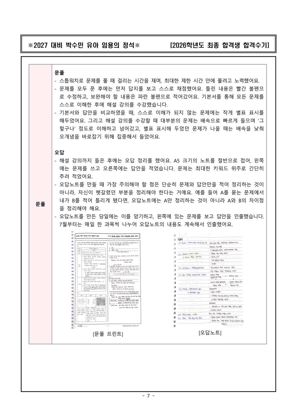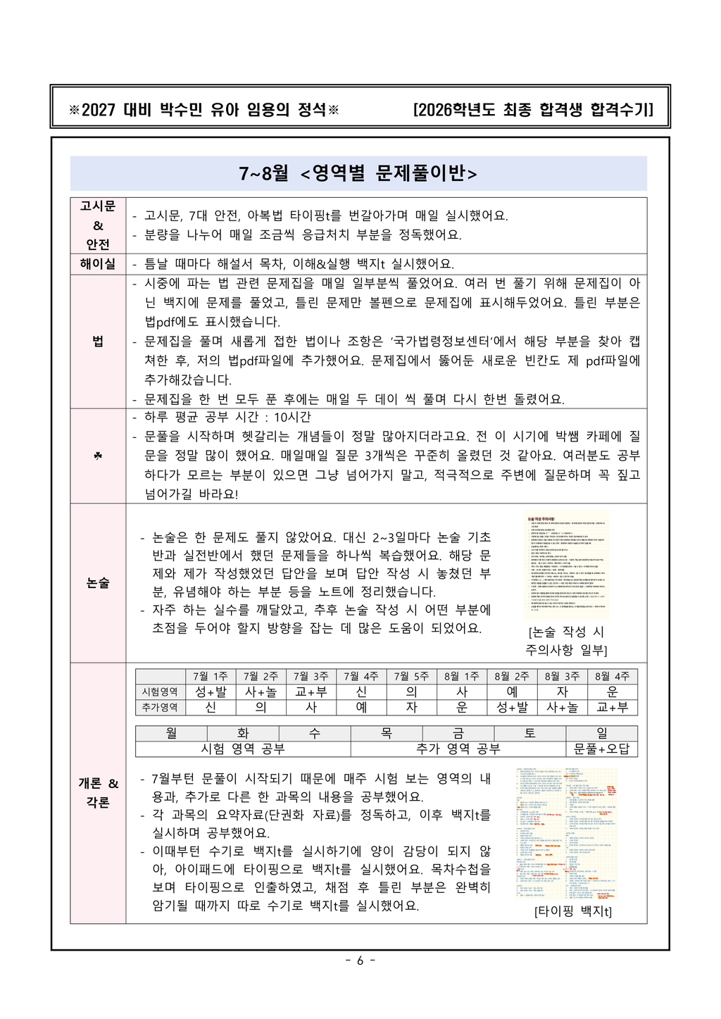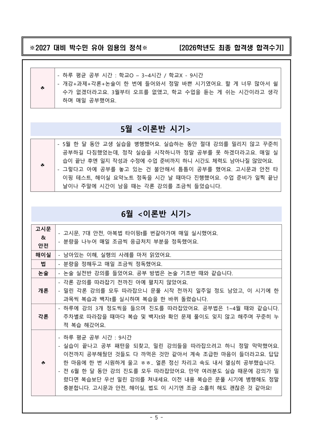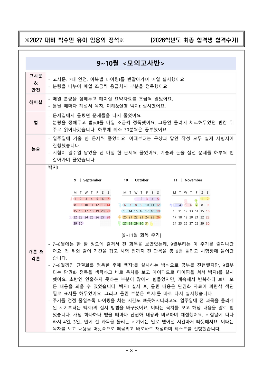 차석(2등) / 초수 / 학부 병행 합격수기 작성자제발꼭합격|작성시간26.02.13|조회수575 목록 댓글 0 글자크기 작게가 글자크기 크게가 안녕하세요 ☺️평가원 지역(전북)에 차석으로 합격하게 된 초수생입니다!1년간의 공부 과정을 담은 제 합격수기가 선생님들께 도움이 되길 바랍니다 🍀2026 박수민 유아 - 최종 합격수기 - 00인 선생님.pdf5.39MB 첨부파일첨부된 파일이 12개 있습니다. jpg 파일 resized_IMG_8677.jpg 다운로드 jpg 파일 resized_IMG_8678.jpg 다운로드 jpg 파일 resized_IMG_8679.jpg 다운로드 jpg 파일 resized_IMG_8680.jpg 다운로드 jpg 파일 resized_IMG_8681.jpg 다운로드 jpg 파일 resized_IMG_8682.jpg 다운로드 jpg 파일 resized_IMG_8683.jpg 다운로드 jpg 파일 resized_IMG_8684.jpg 다운로드 jpg 파일 resized_IMG_8685.jpg 다운로드 jpg 파일 resized_IMG_8686.jpg 다운로드 jpg 파일 resized_IMG_8687.jpg 다운로드 pdf 파일 2026 박수민 유아 - 최종 합격수기 - 00인 선생님.pdf 다운로드 다음검색 현재 게시글 추가 기능 열기 북마크 공유하기 신고 센터로 신고 댓글 댓글 0 댓글쓰기 답글쓰기 댓글 리스트